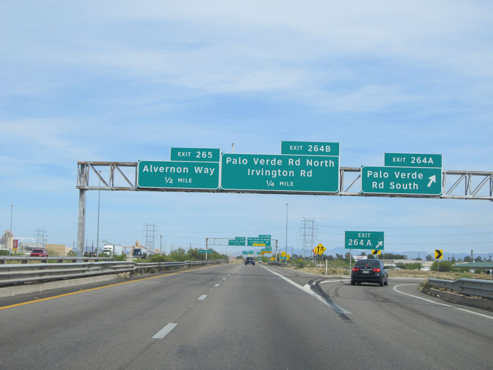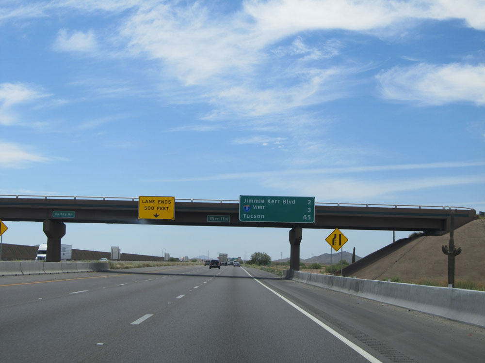 Overhead mileage sign near mile marker 195. It's 2 miles to the next exit (Jimmie Kerr Blvd), 3 miles to the junction of Interstate 8 West, and 65 miles to Tucson. (Photo taken 5/20/15). |
