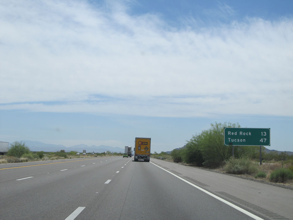 Mileage sign on Interstate 10 East. It's 13 miles to Red Rock and 47 miles to Tucson. (Photo taken 5/20/15). |