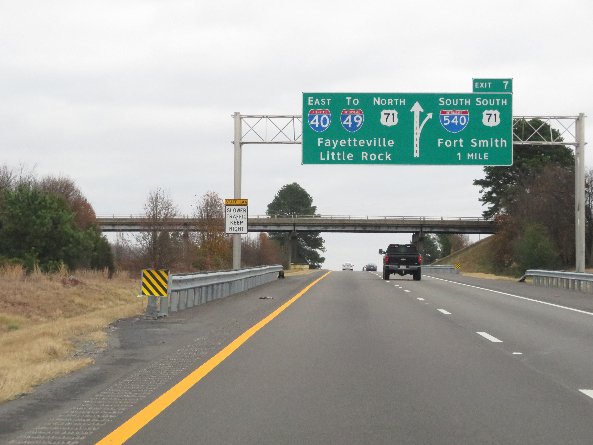 Interstate 40 East at Exit 7: Interstate 540 South / US 71 South - Fort Smith (Photo taken 12/12/20). |