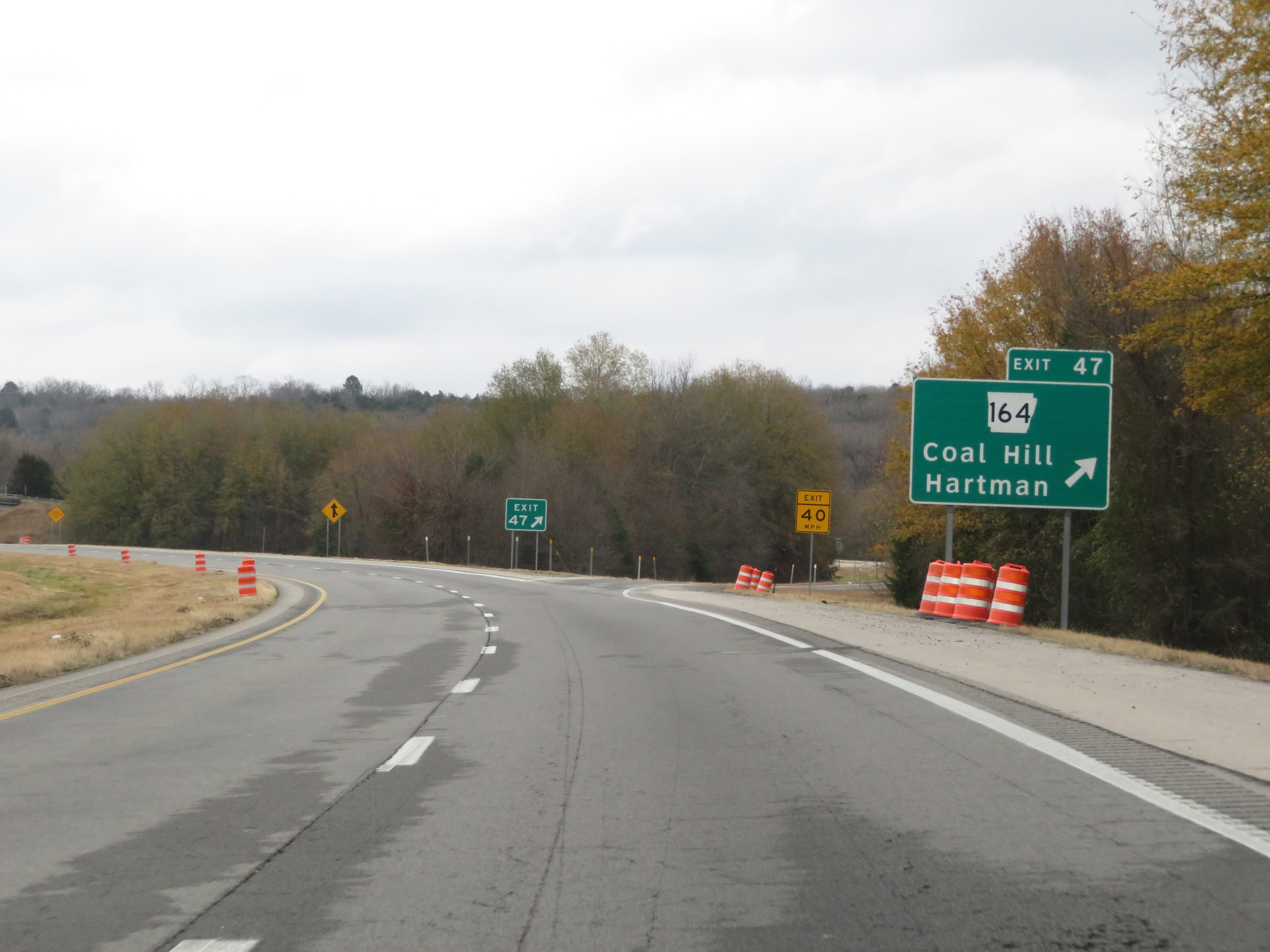Interstate 40 East at Exit 47: AR 164 - Coal Hill / Hartman (Photo taken 12/12/20). |