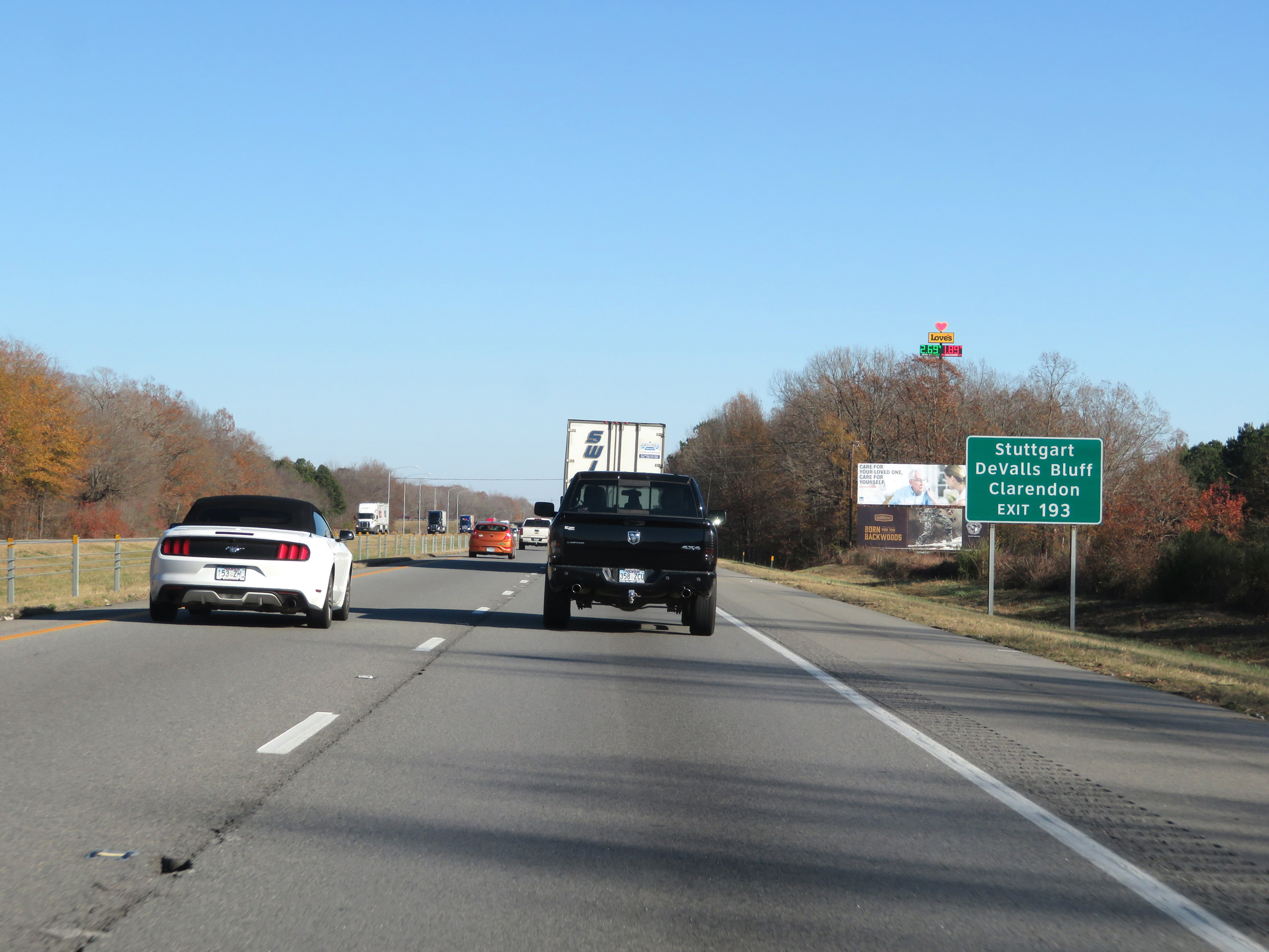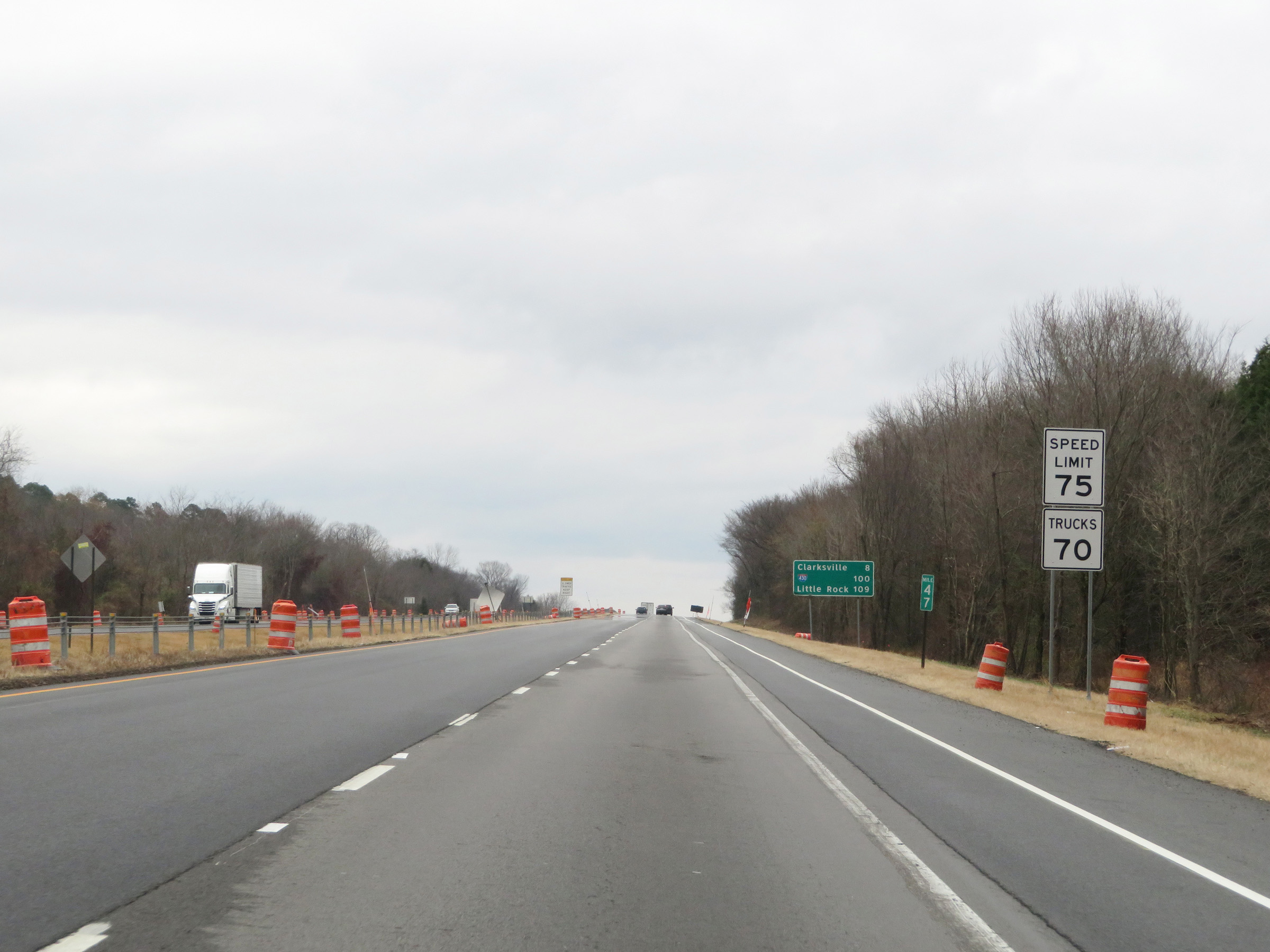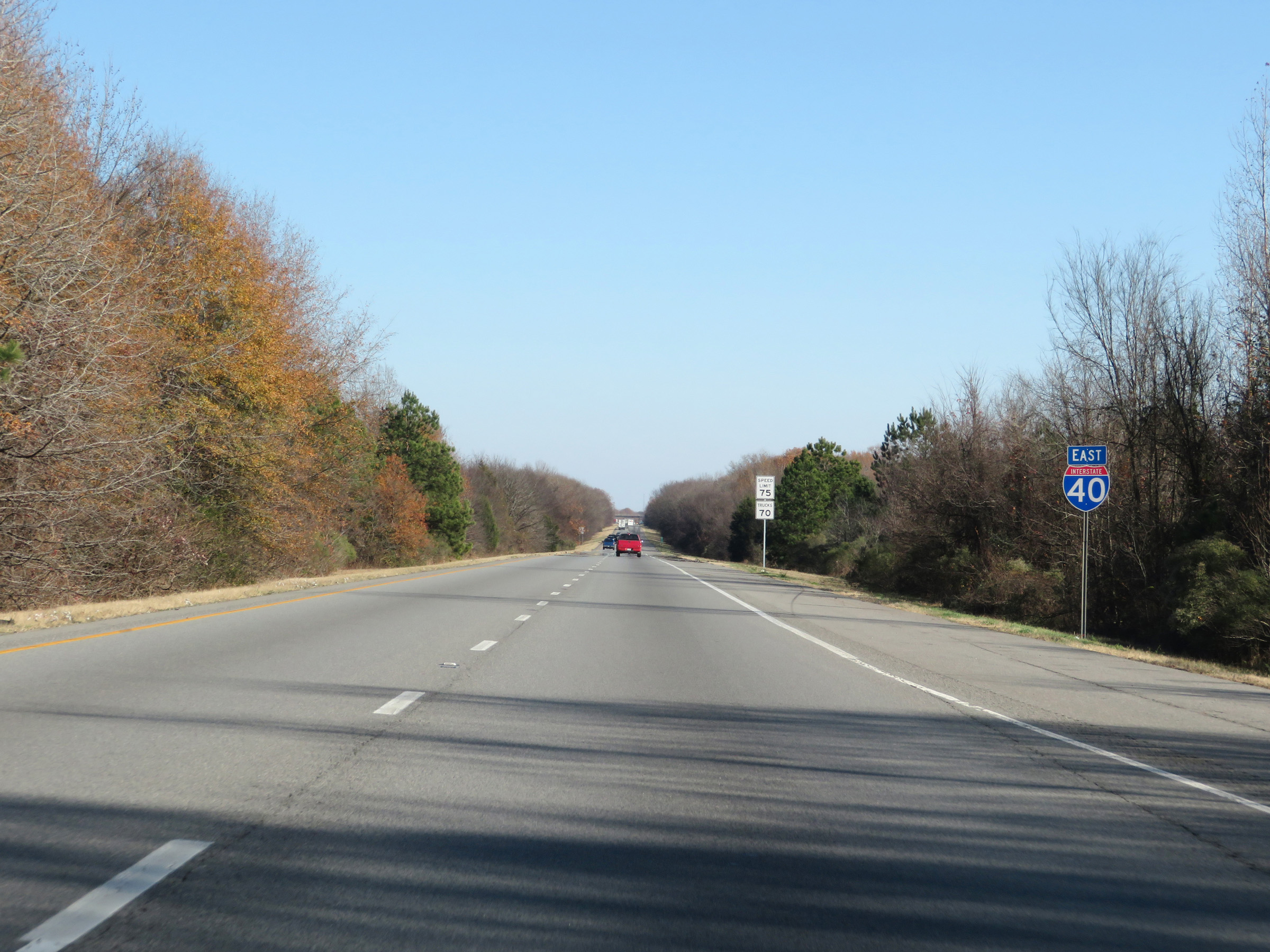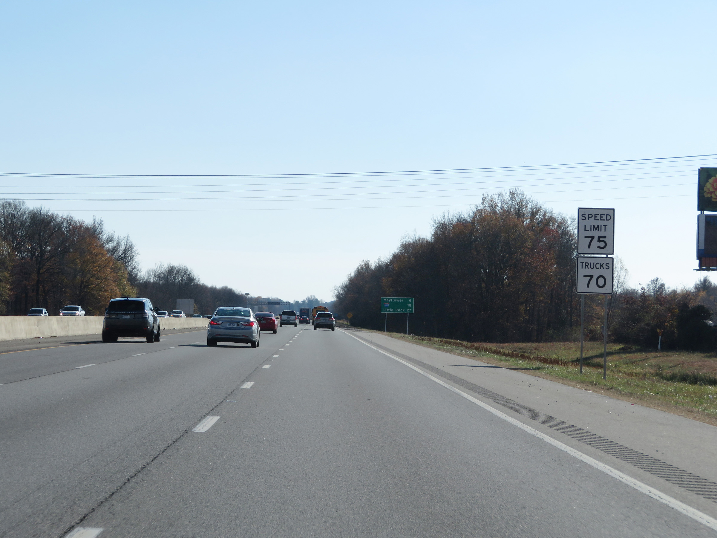 The speed limits on Interstate 40 East in Arkansas start out at 75 mph for automobiles and 70 mph for trucks. These are the standard speed limits on most rural Interstate highways in Arkansas. (Photo taken 12/12/20). |