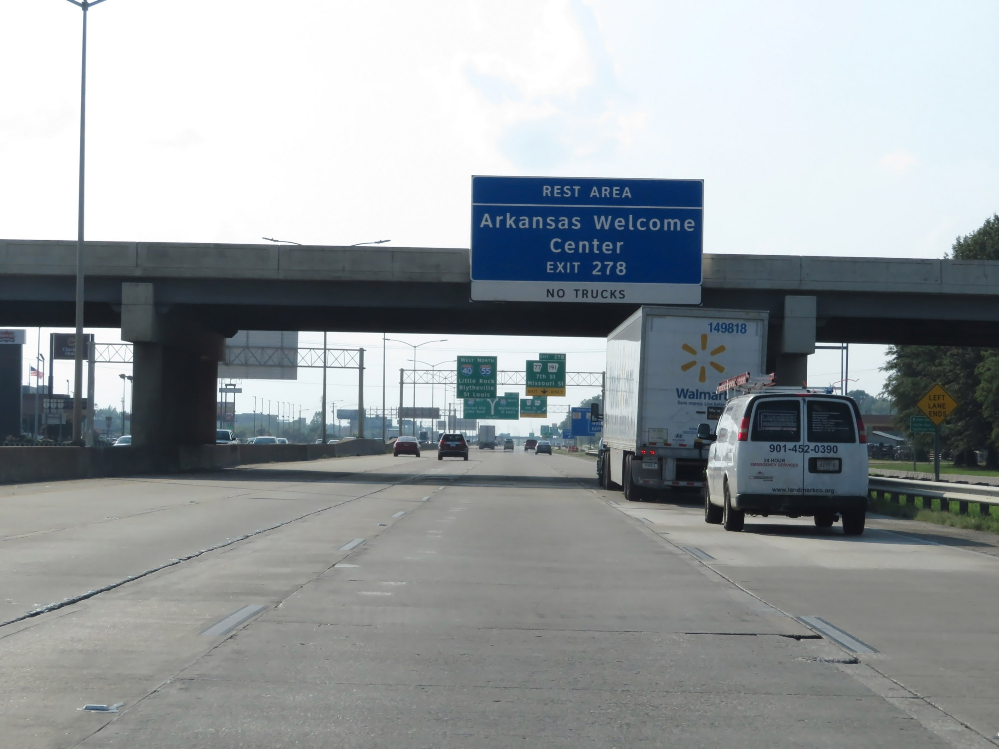Interstate 55 North as the westbound lanes of Interstate 40 join up with it for a brief concurrency in West Memphis. During this concurrency, the exit numbers are based on the mileage of I-40. Take Exit 278 to the Arkansas Welcome Center / Rest Area. (Photo taken 8/12/19). |