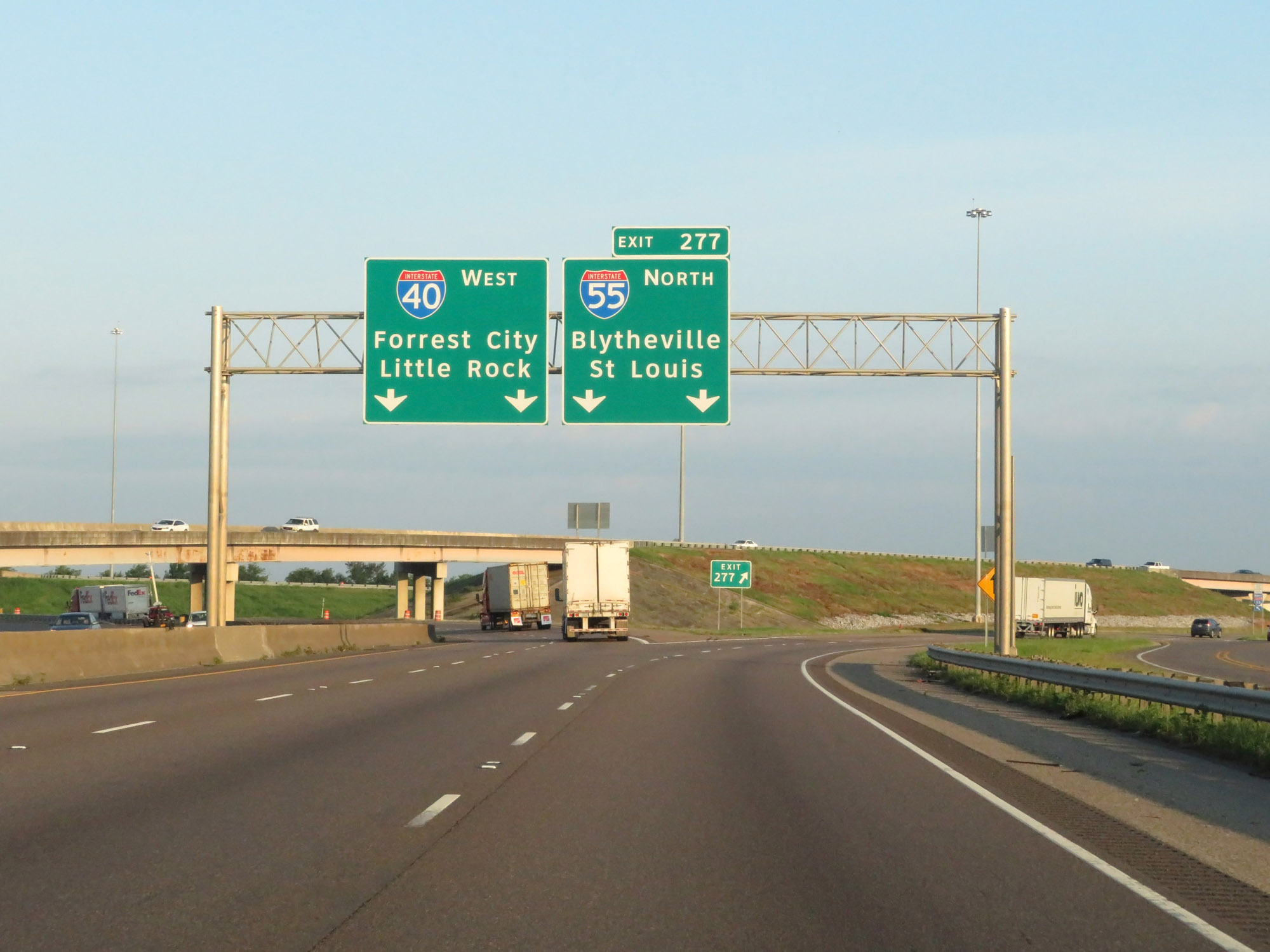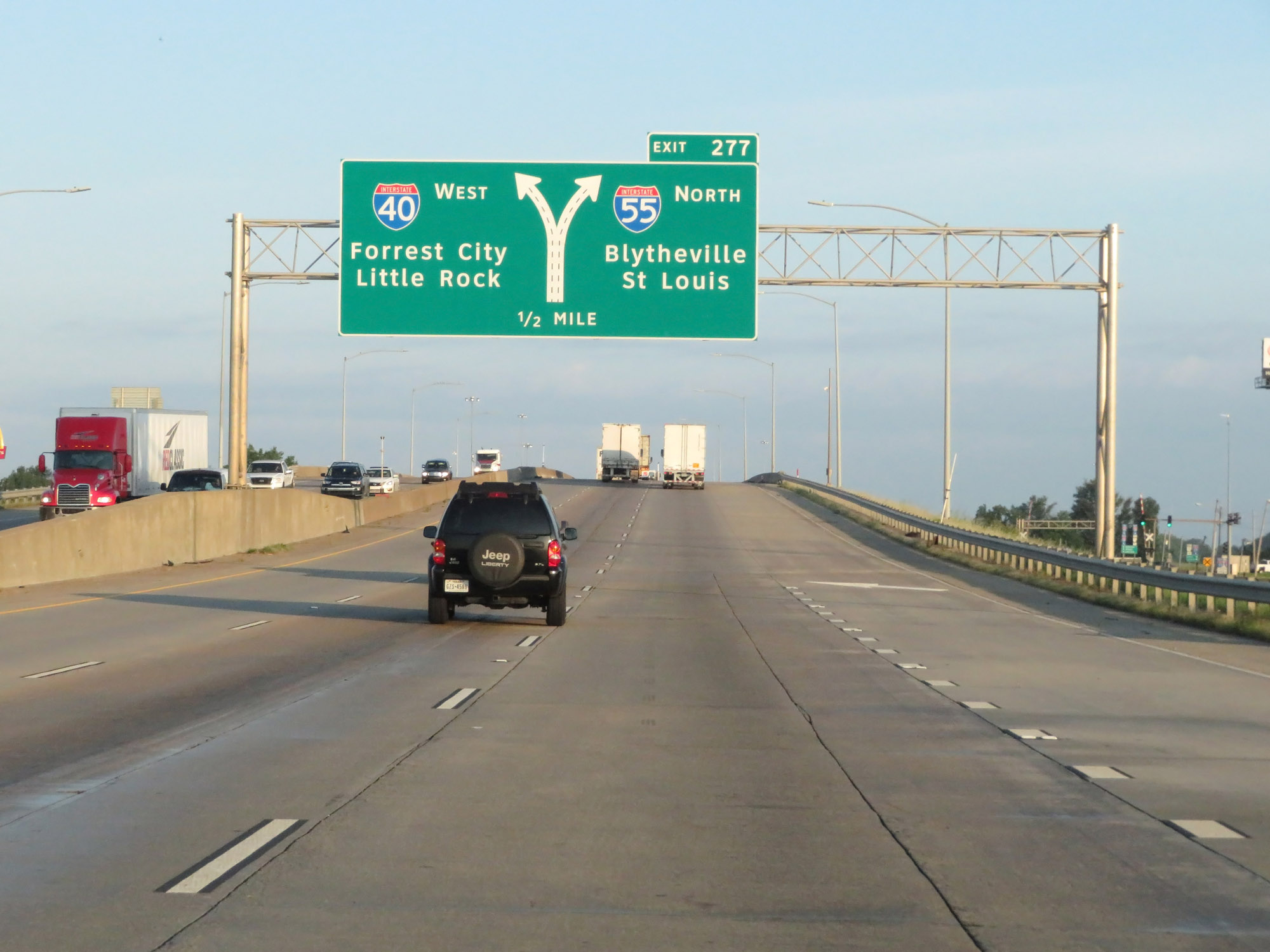 Interstate 55 North / Interstate 40 West at Exit 277: Interstate 55 North - Blytheville / St Louis (Photo taken 8/13/19). |