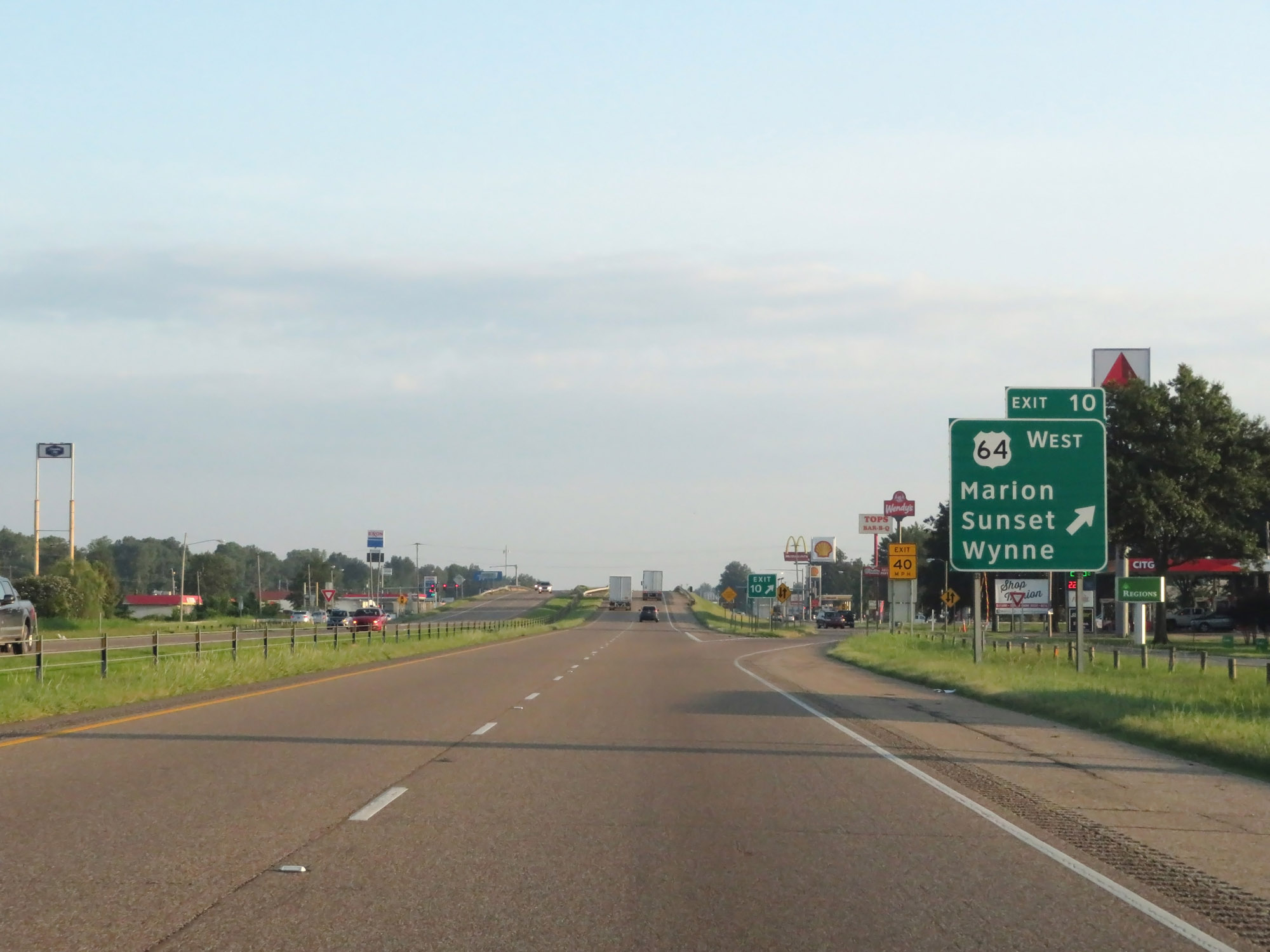 Interstate 55 North at Exit 10: US 64 West - Marion / Sunset / Wynne (Photo taken 8/13/19). |