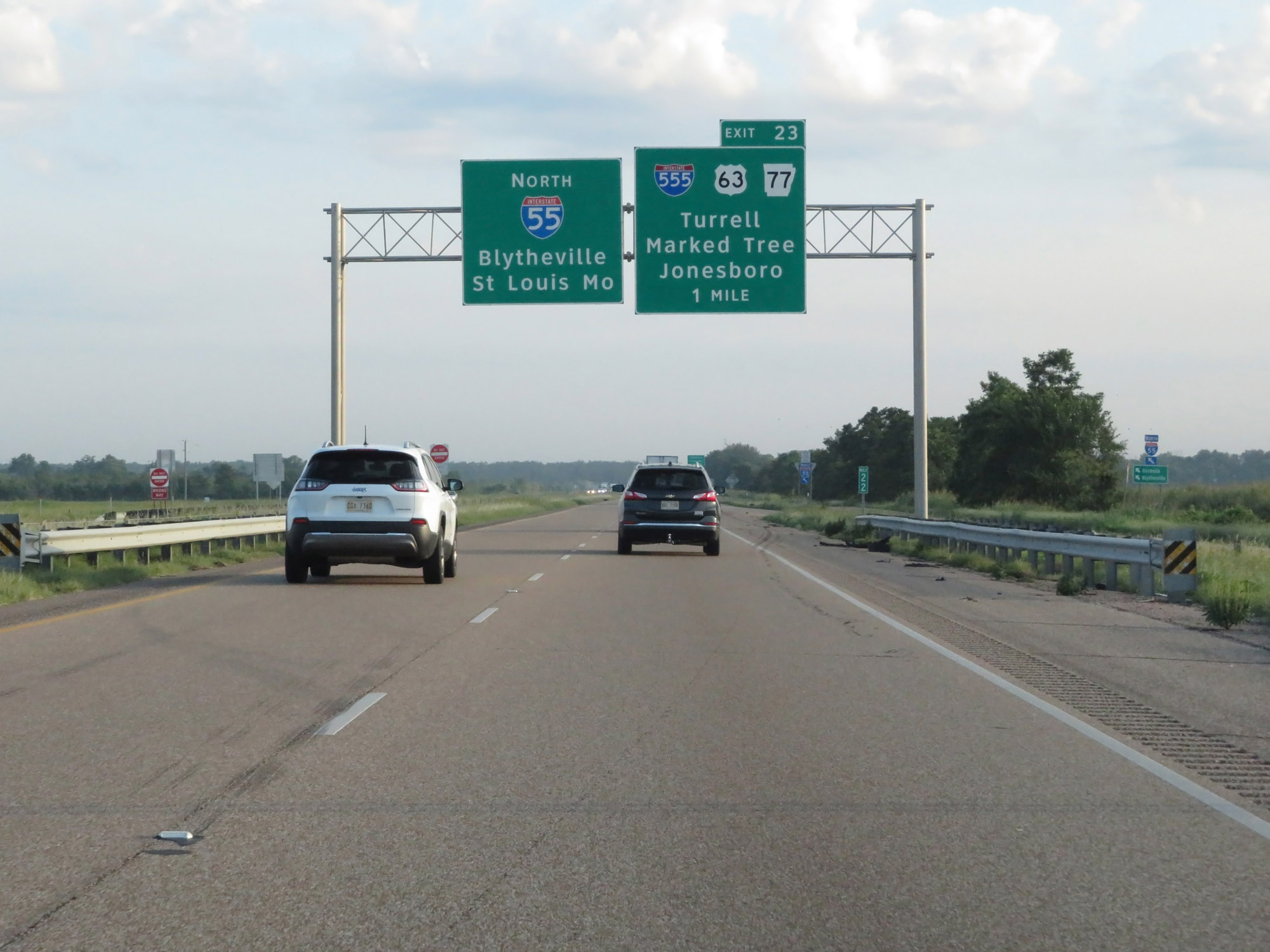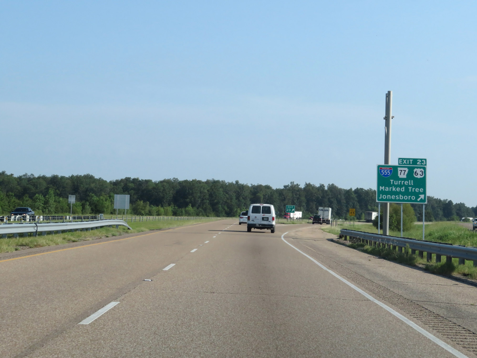 Interstate 55 North at Exit 23: Interstate 555 / US 63 / AR 77 - Turrell / Marked Tree / Jonesboro (Photo taken 8/13/19). |