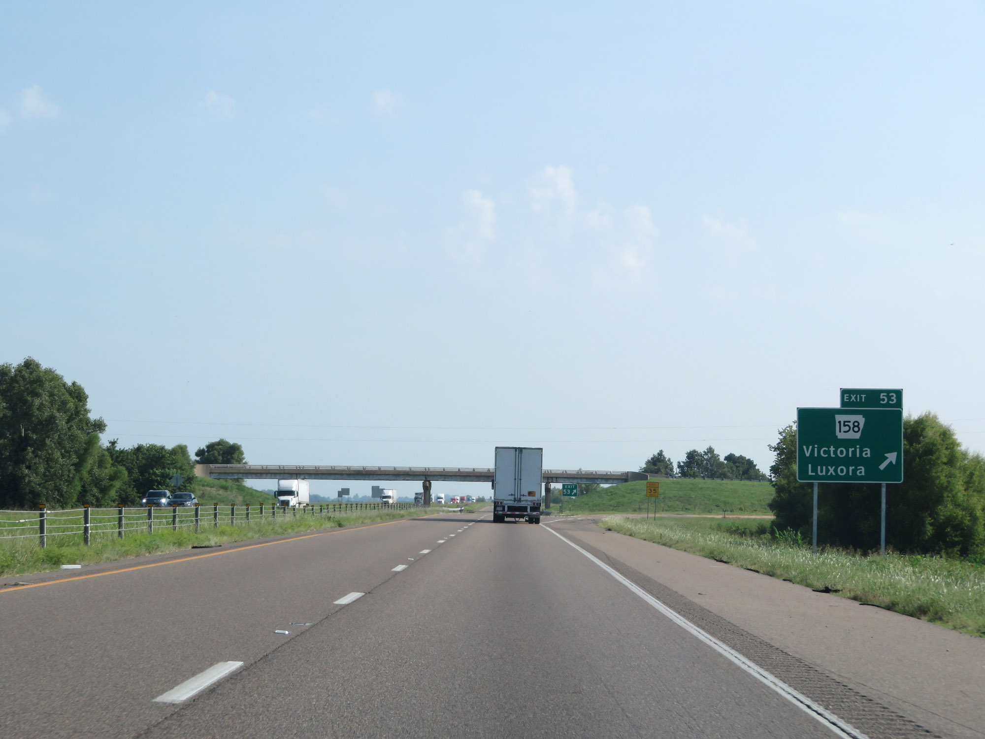 Interstate 55 North at Exit 53: AR 158 - Victoria / Luxora (Photo taken 8/13/19). |