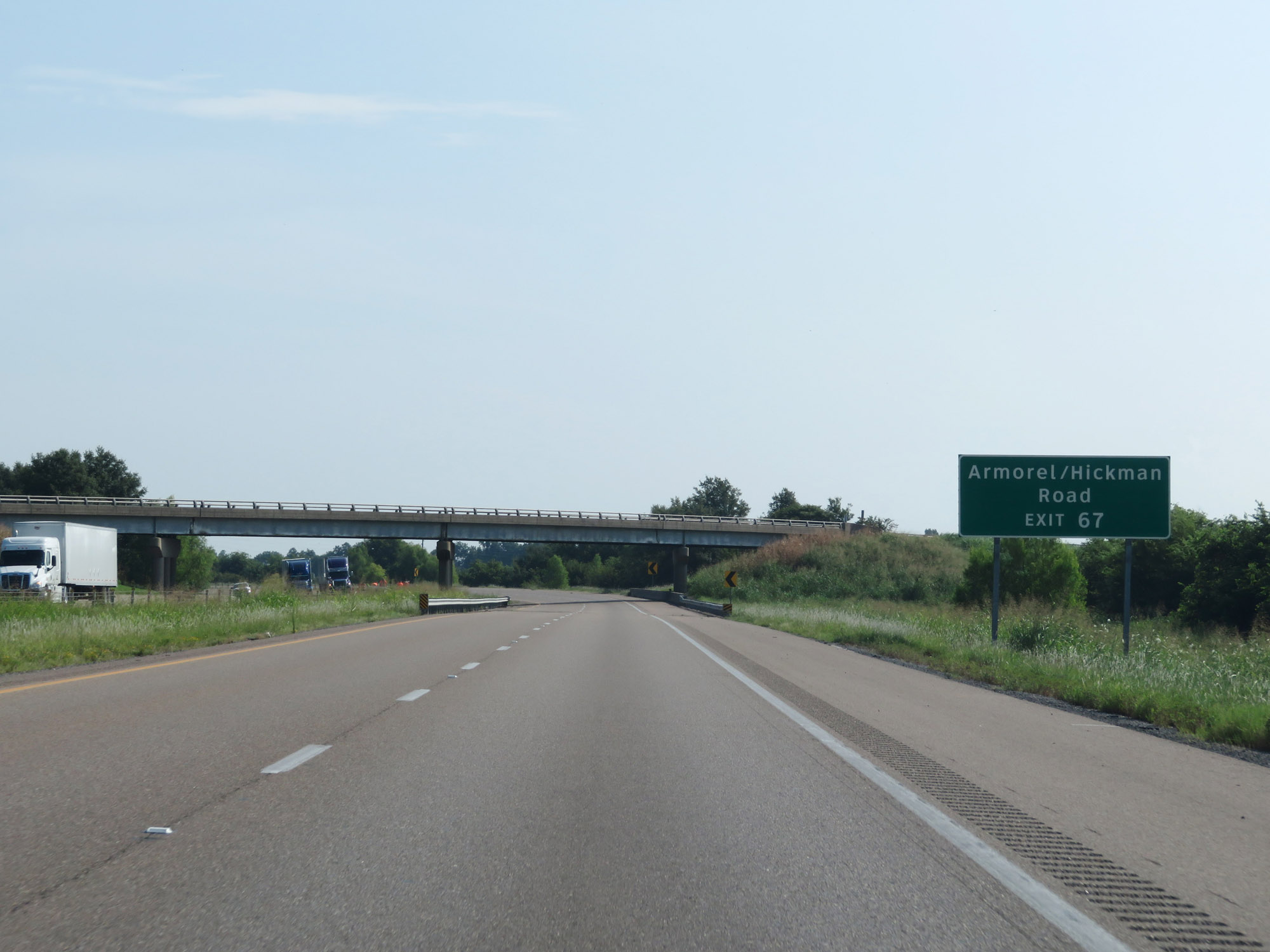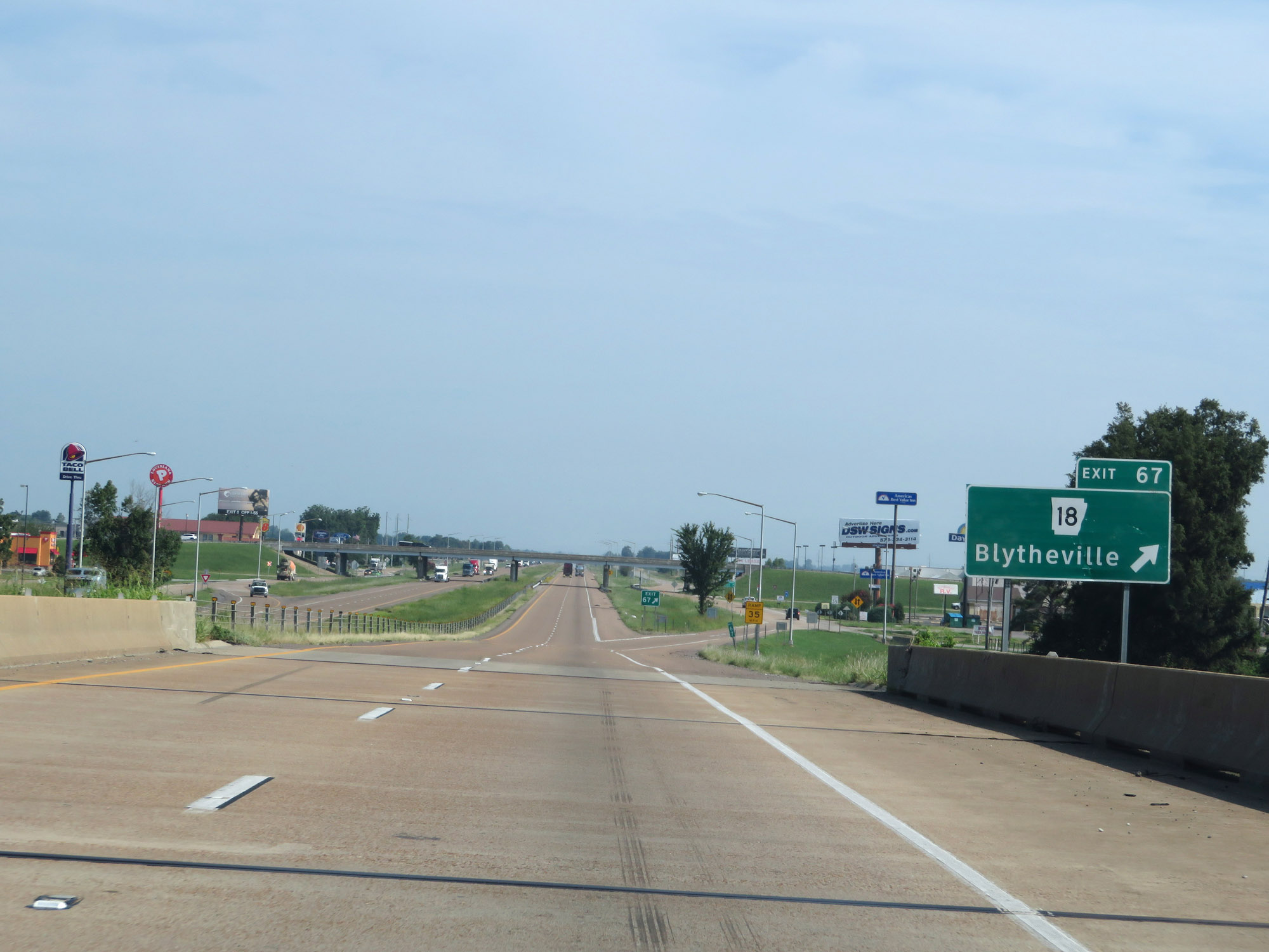 Interstate 55 North at Exit 67: AR 18 - Blytheville (Photo taken 8/13/19). |