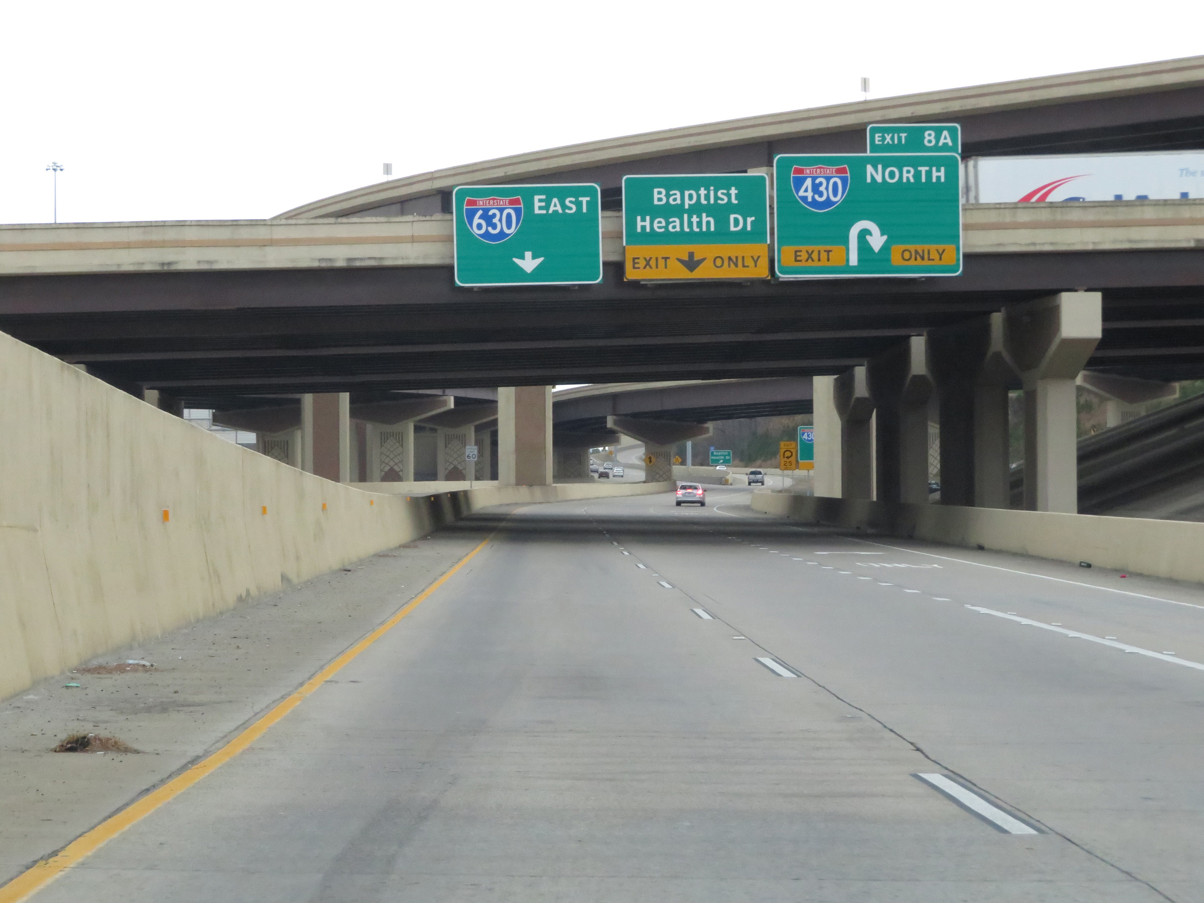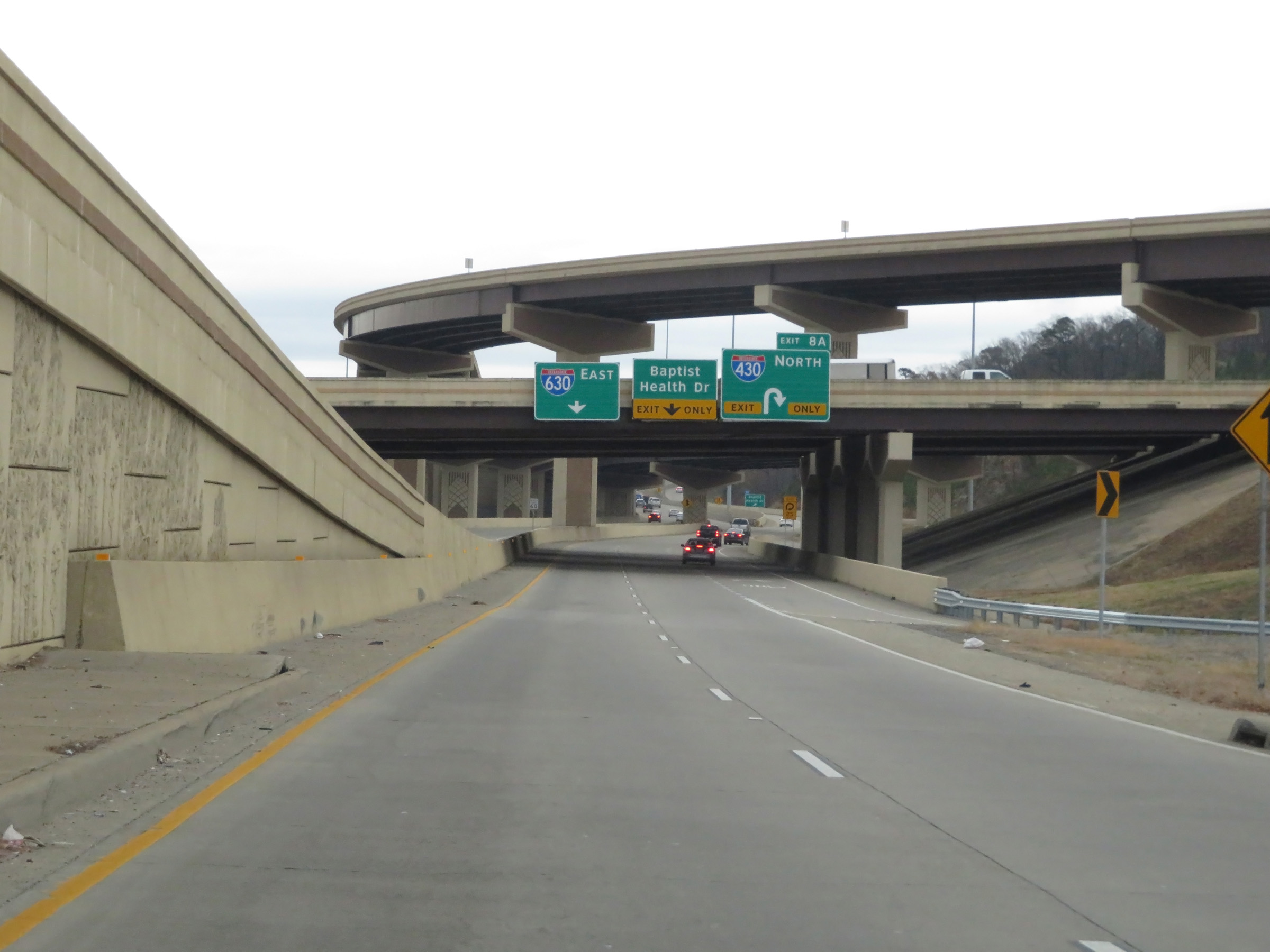 Interstate 630 East at Exit 8A: Interstate 430 North. Here, this ramp passes under Interstate 430 at which point I-630 East begins. Ahead, it will provide access to Baptist Health Dr. (Photo taken 12/11/20). |