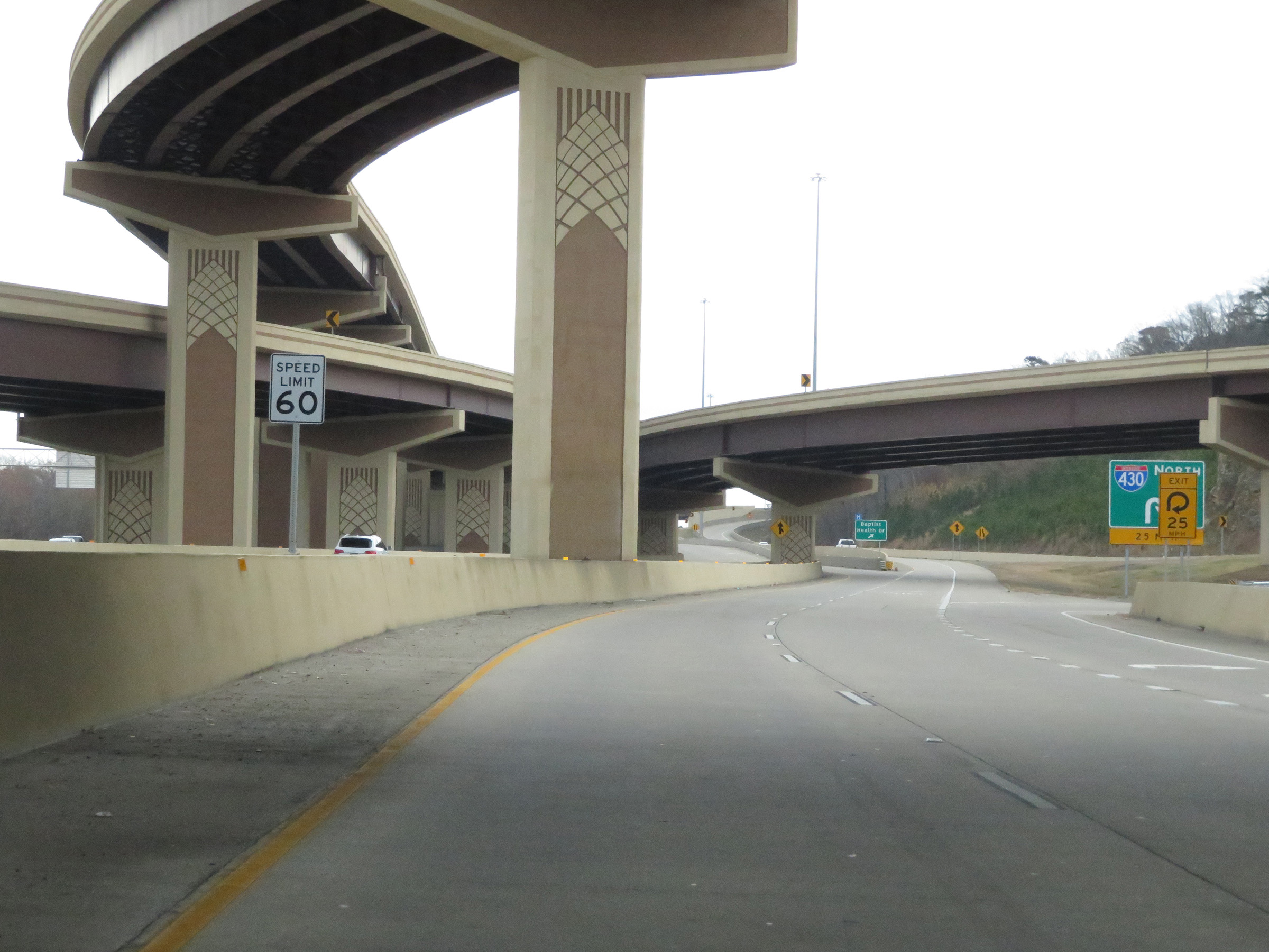 A view of the ramp to Interstate 430 North via Exit 8A. The overpass ahead is the ramp from Interstate 430 North to Interstate 630 East. (Photo taken 12/11/20). |