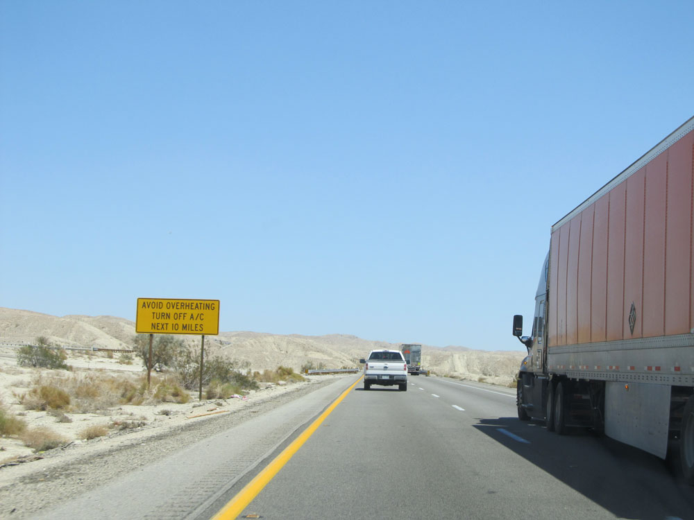 Considering we were at an elevation below sea level in Indio, we have to go up, up, up sometime soon. That time is now. Before we go up a 10-mile climb, this sign warns trucks to turn off their air conditioning to prevent overheating for the next 10 miles. I never knew A/C could lead to overheating. (Photo taken 5/19/15). |