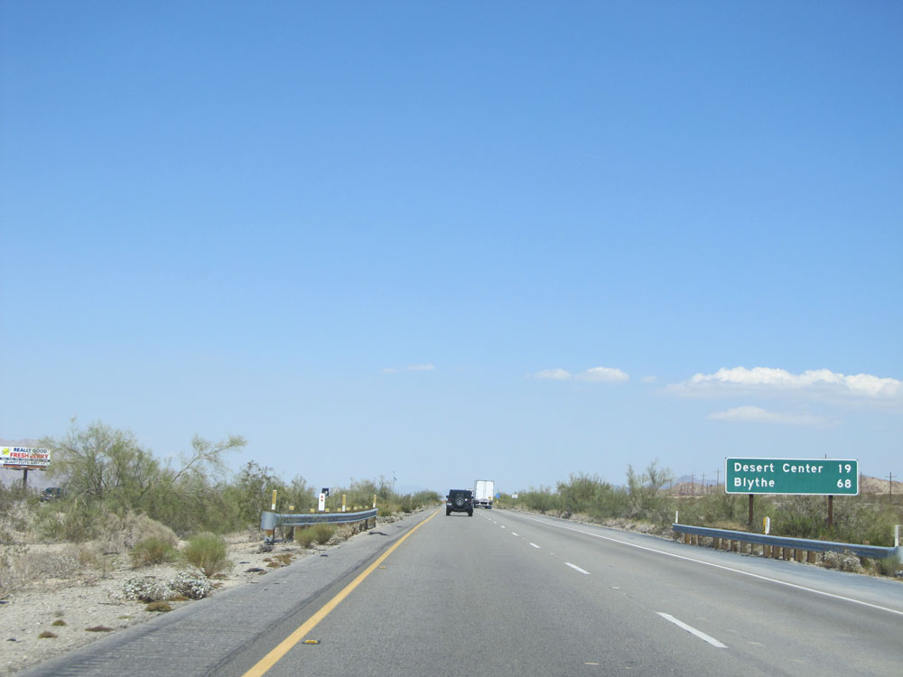 Mileage sign just past Exit 173. It's 19 miles to Desert Center and 68 miles to Blythe. (Photo taken 5/19/15). |