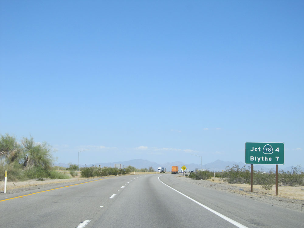 Mileage sign on Interstate 10 East. It's 4 miles to the junction of CA 78 and 7 miles to Blythe. (Photo taken 5/19/15). |