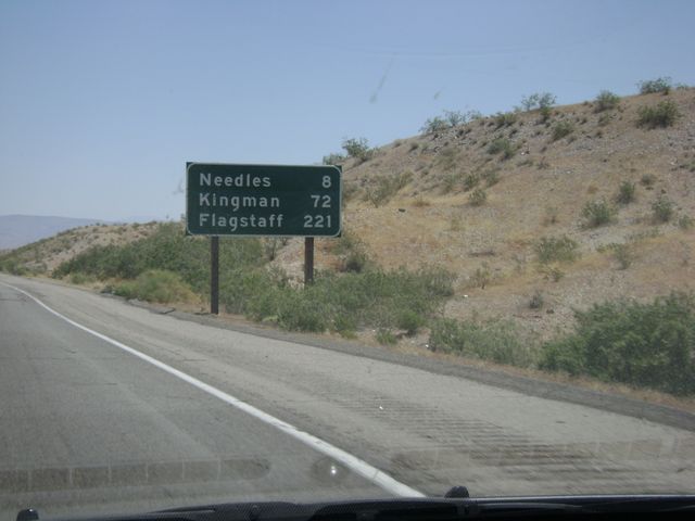 Mileage sign near mile marker 136. Needles is now just 8 miles ahead, while Kingman, AZ is 72 miles ahead and it's 221 miles yet to Flagstaff, AZ on I-40. (Photo taken 5/21/10). |