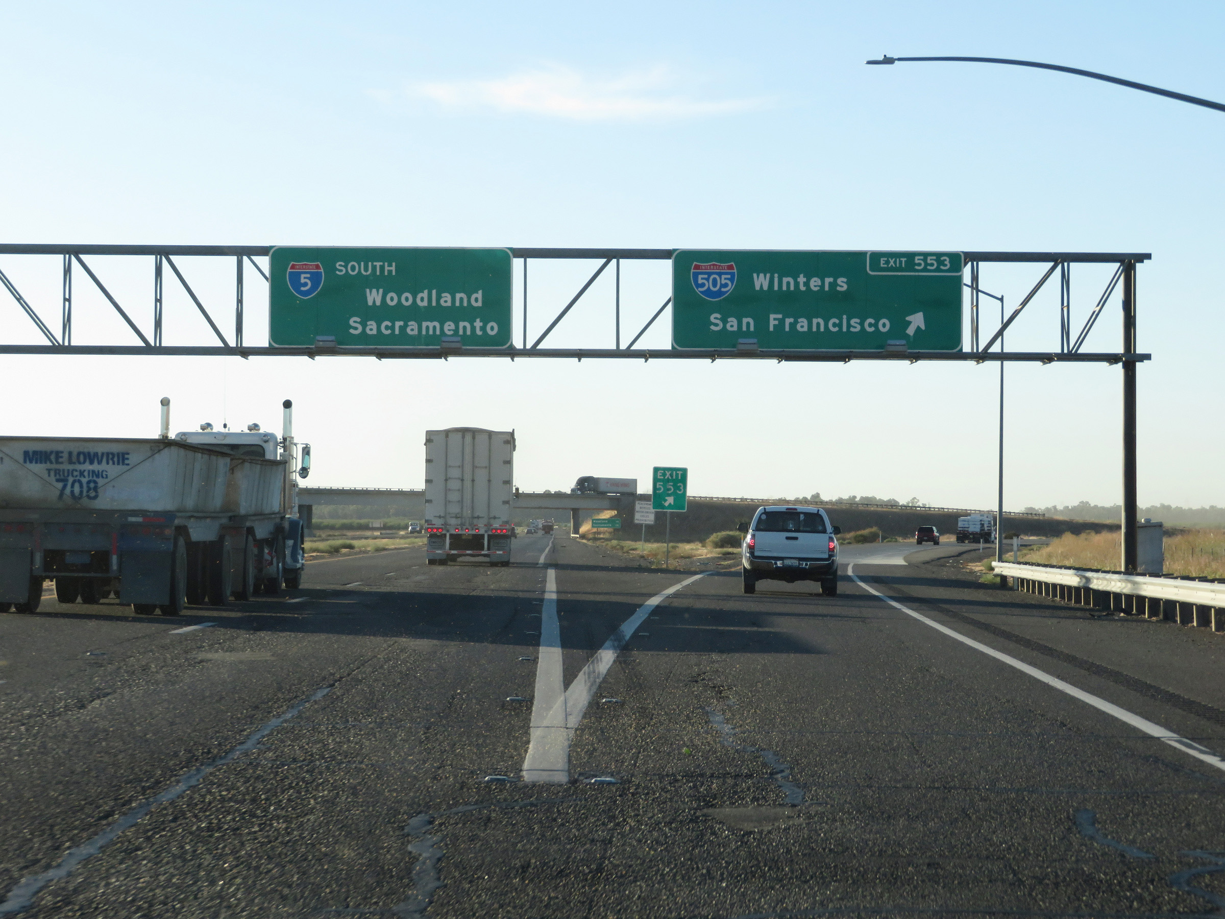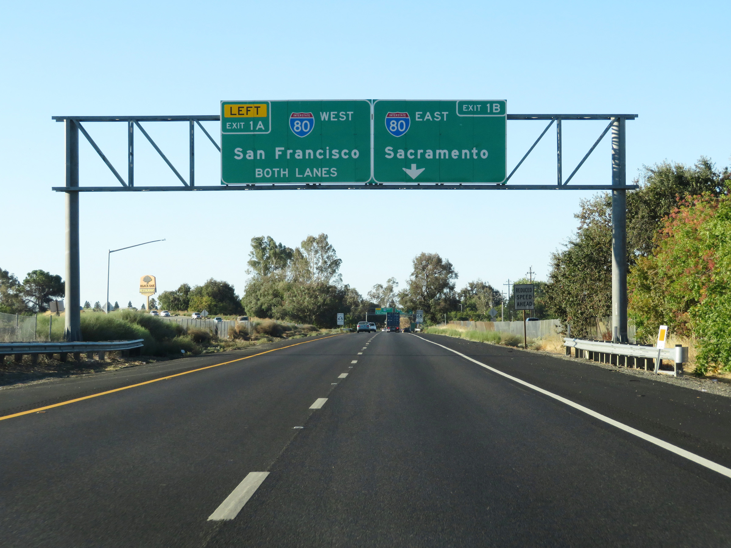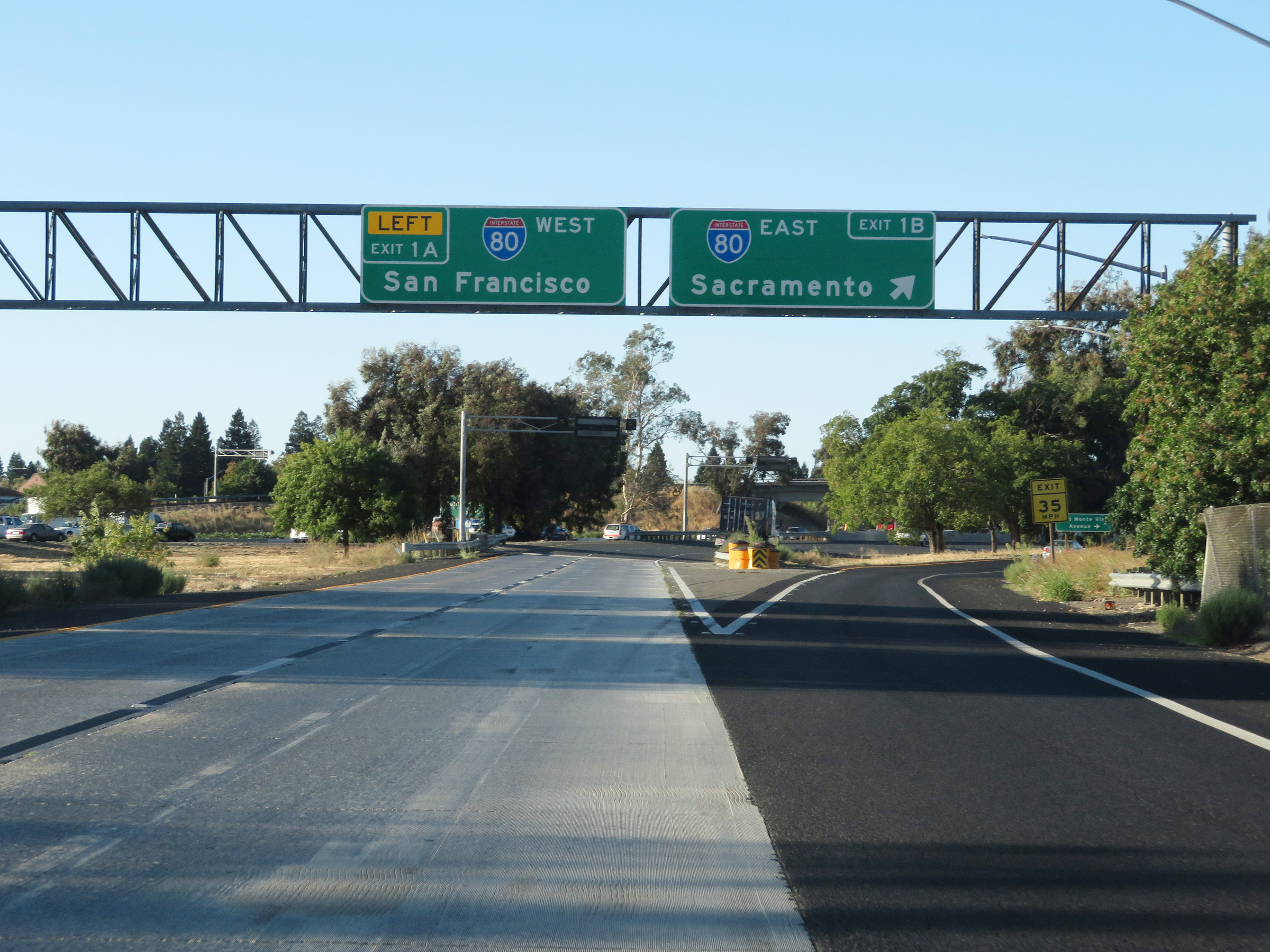 Interstate 505 South at Exit 1B: Interstate 80 East - Sacramento; Exit 1A: Interstate 80 West - San Francisco (Photo taken 9/24/19). |