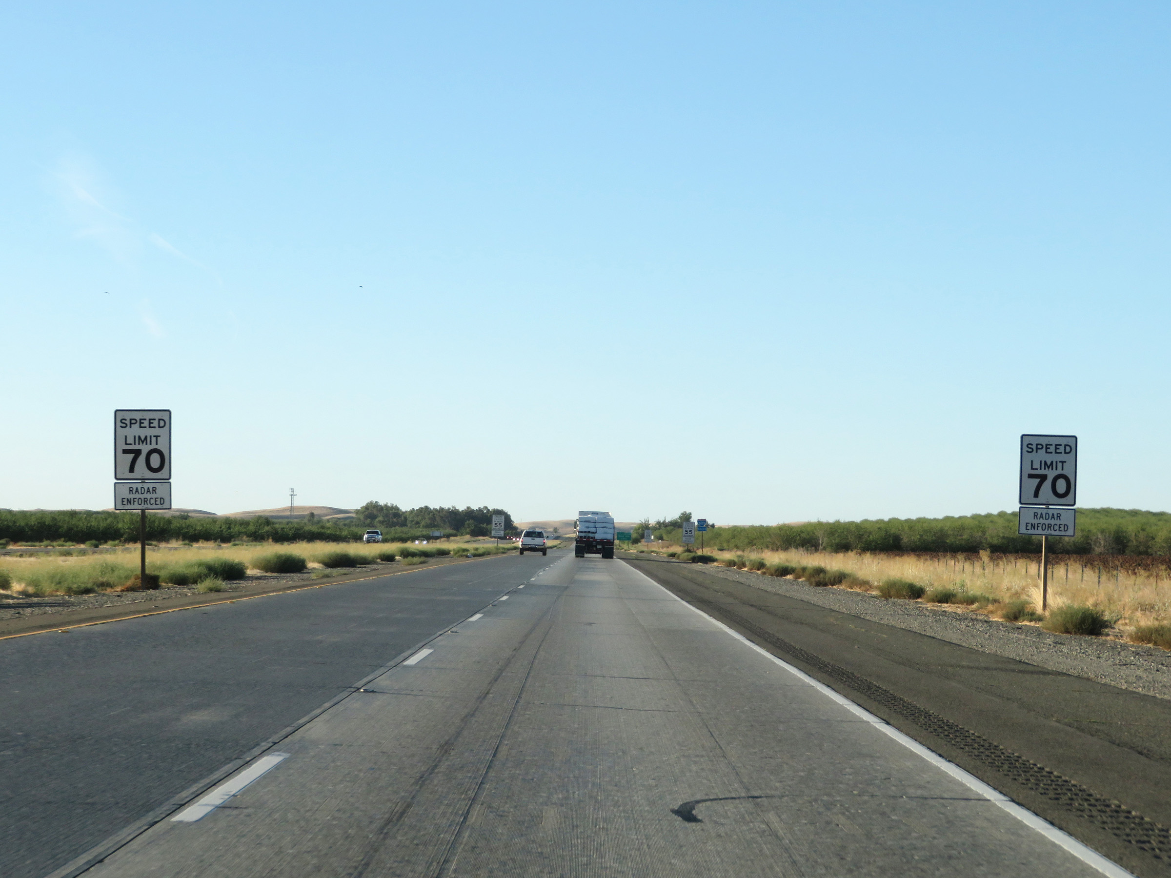 The speed limit on Interstate 505 South starts out at 70 mph for automobiles. This is the standard maximum speed limit for cars on most rural Interstate highways in California. (Photo taken 9/24/19). |