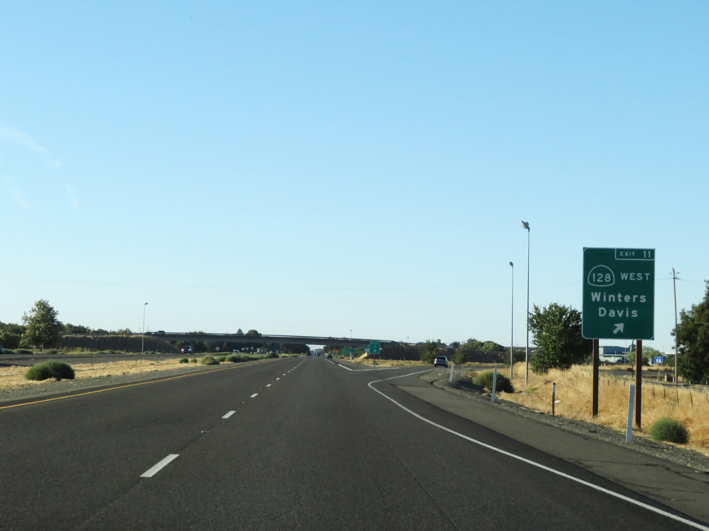 Interstate 505 South at Exit 11: CA 128 West - Winters / Davis (Photo taken 9/24/19). |