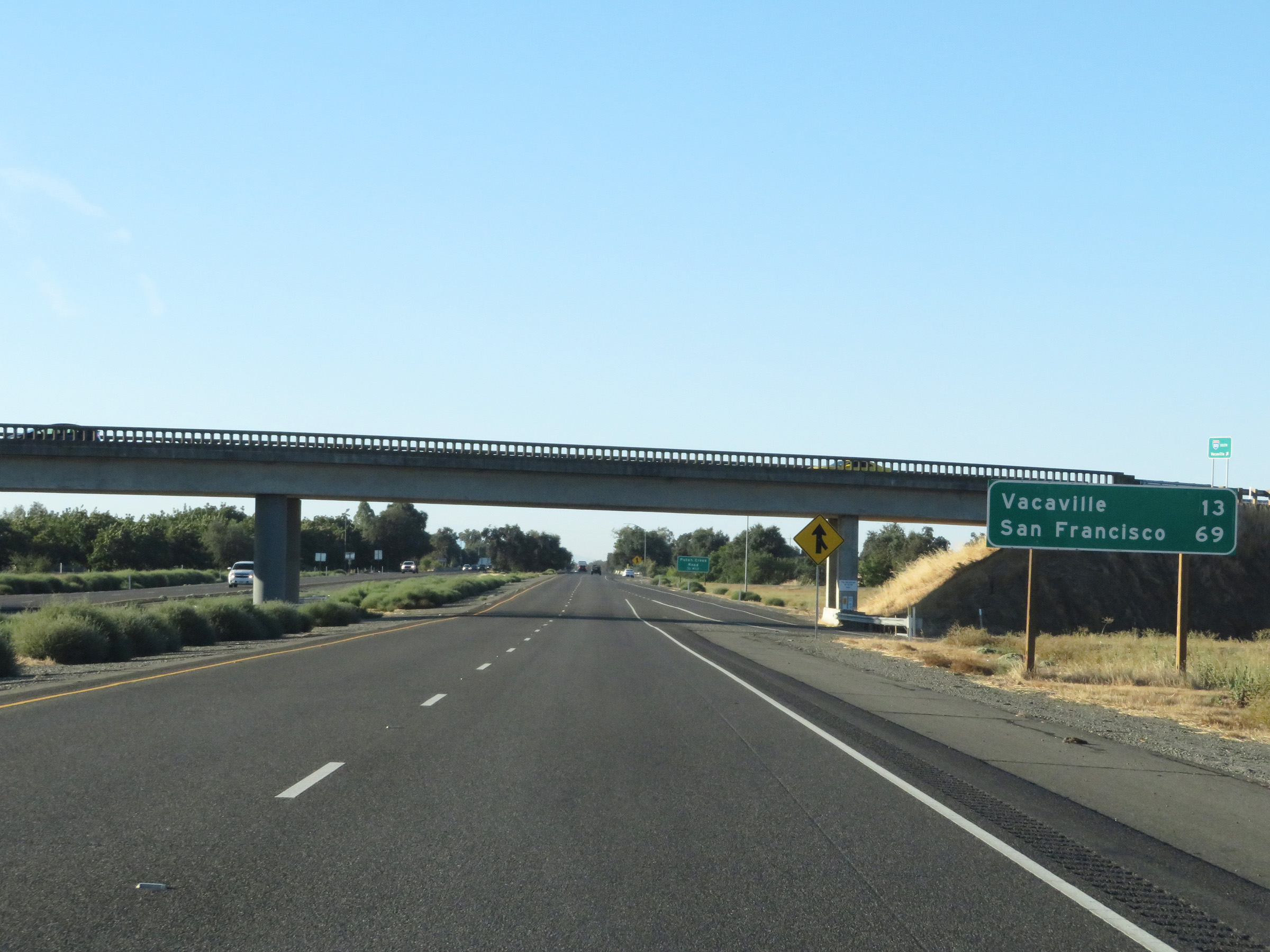 Another mileage sign on Interstate 505 South. It's 13 miles to Vacaville and 69 miles to San Francisco. (Photo taken 9/24/19). |
