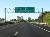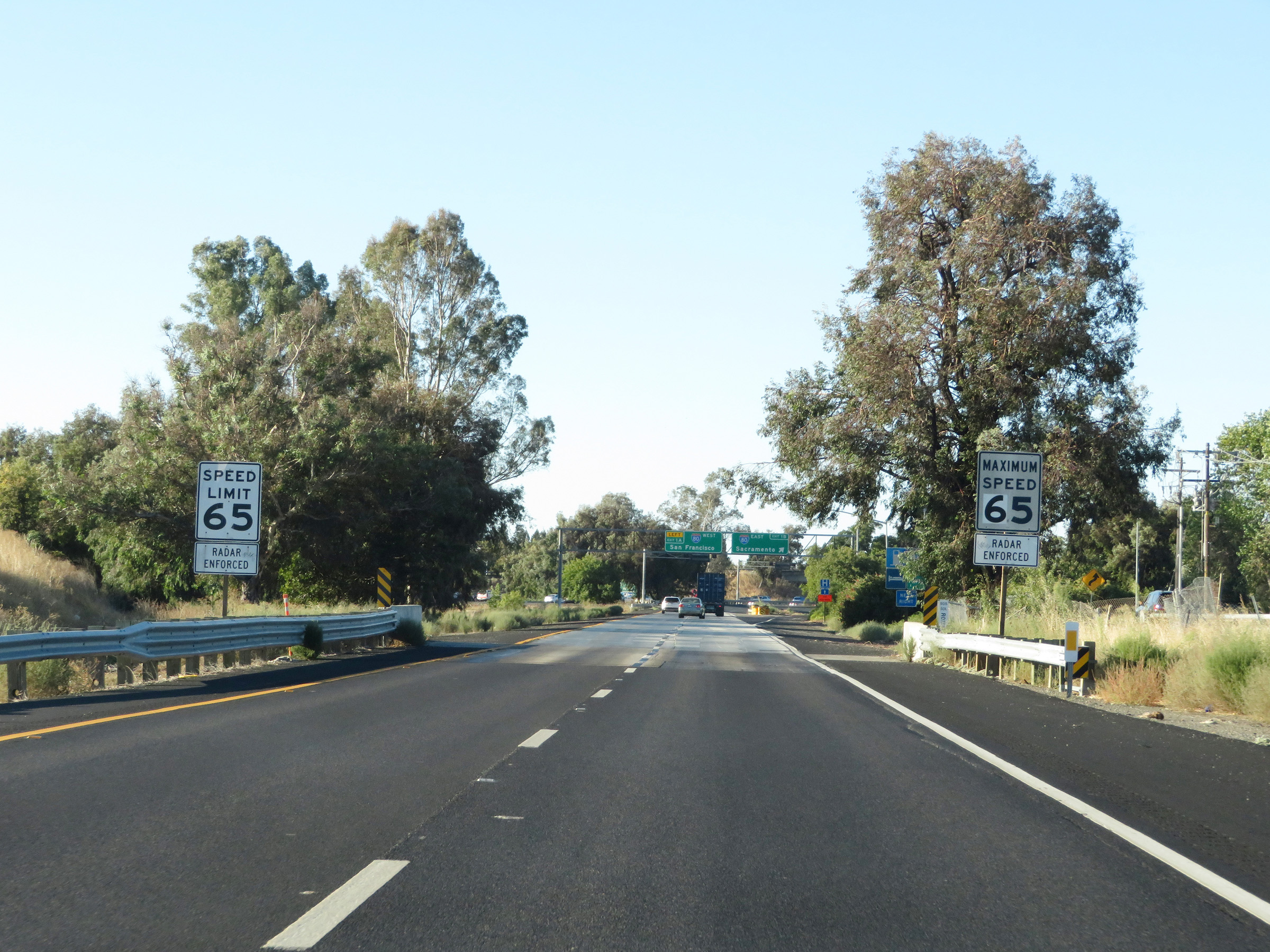 Approaching the southern terminus of Interstate 505 at the junction of Interstate 80, the maximum speed limit for automobiles is reduced to 65 mph. (Photo taken 9/24/19). |
