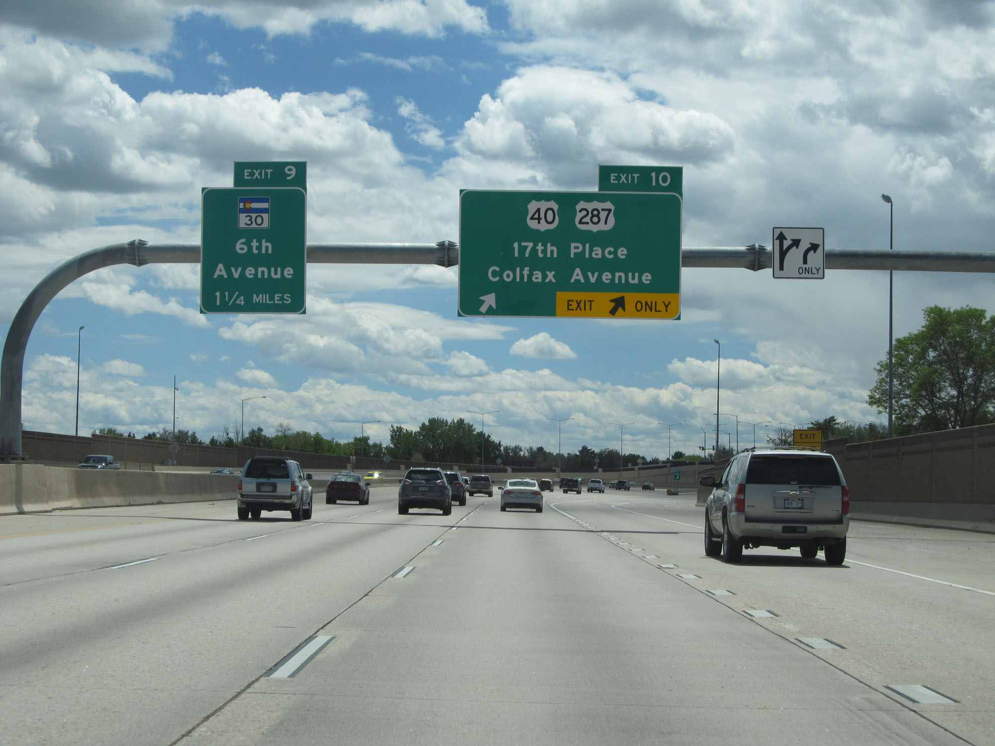 Interstate 225 South at Exit 10: US 40 / US 287 - 17th Place / Colfax Avenue (Photo taken 5/28/16). |