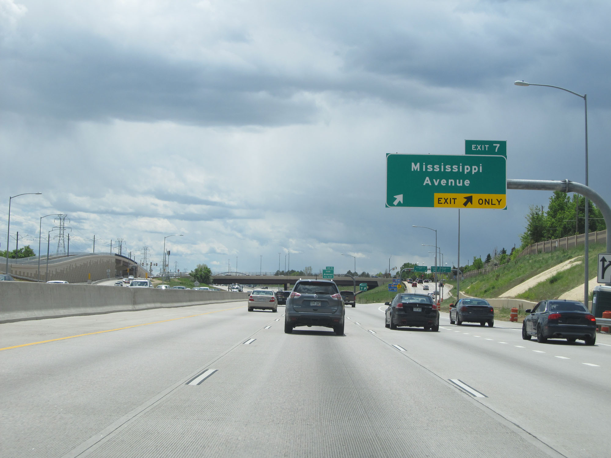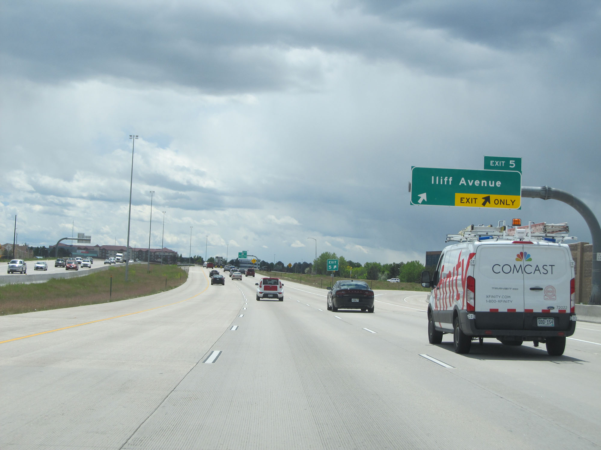 Interstate 225 South at Exit 5: Iliff Avenue (Photo taken 5/28/16). |