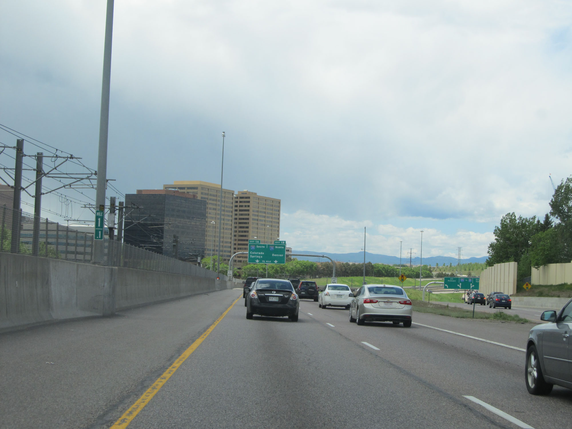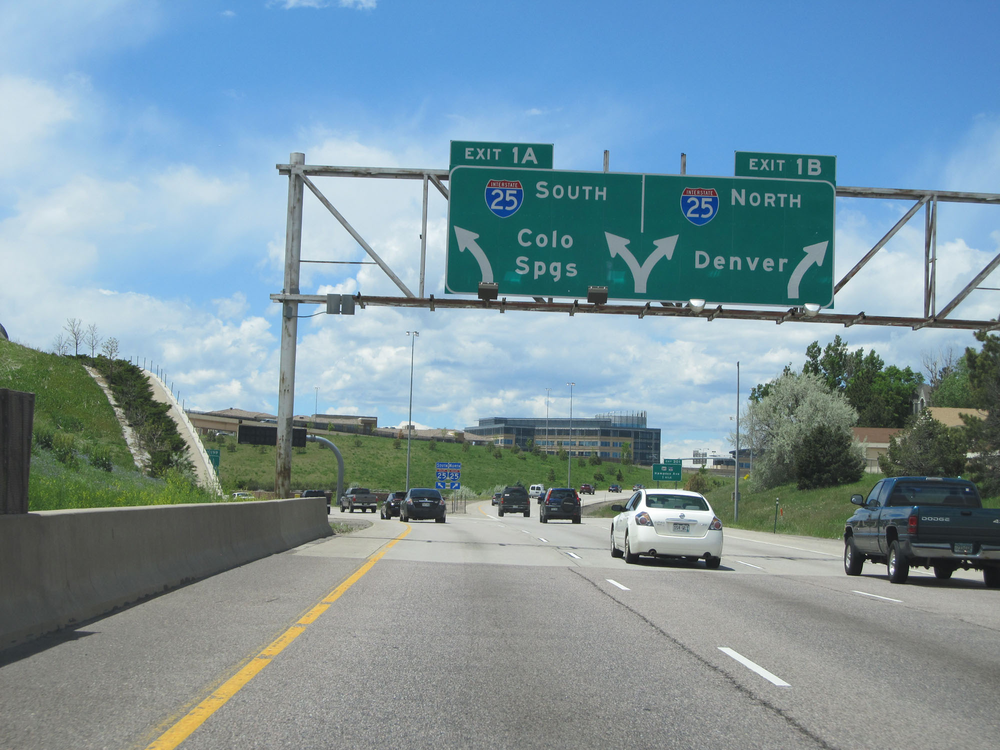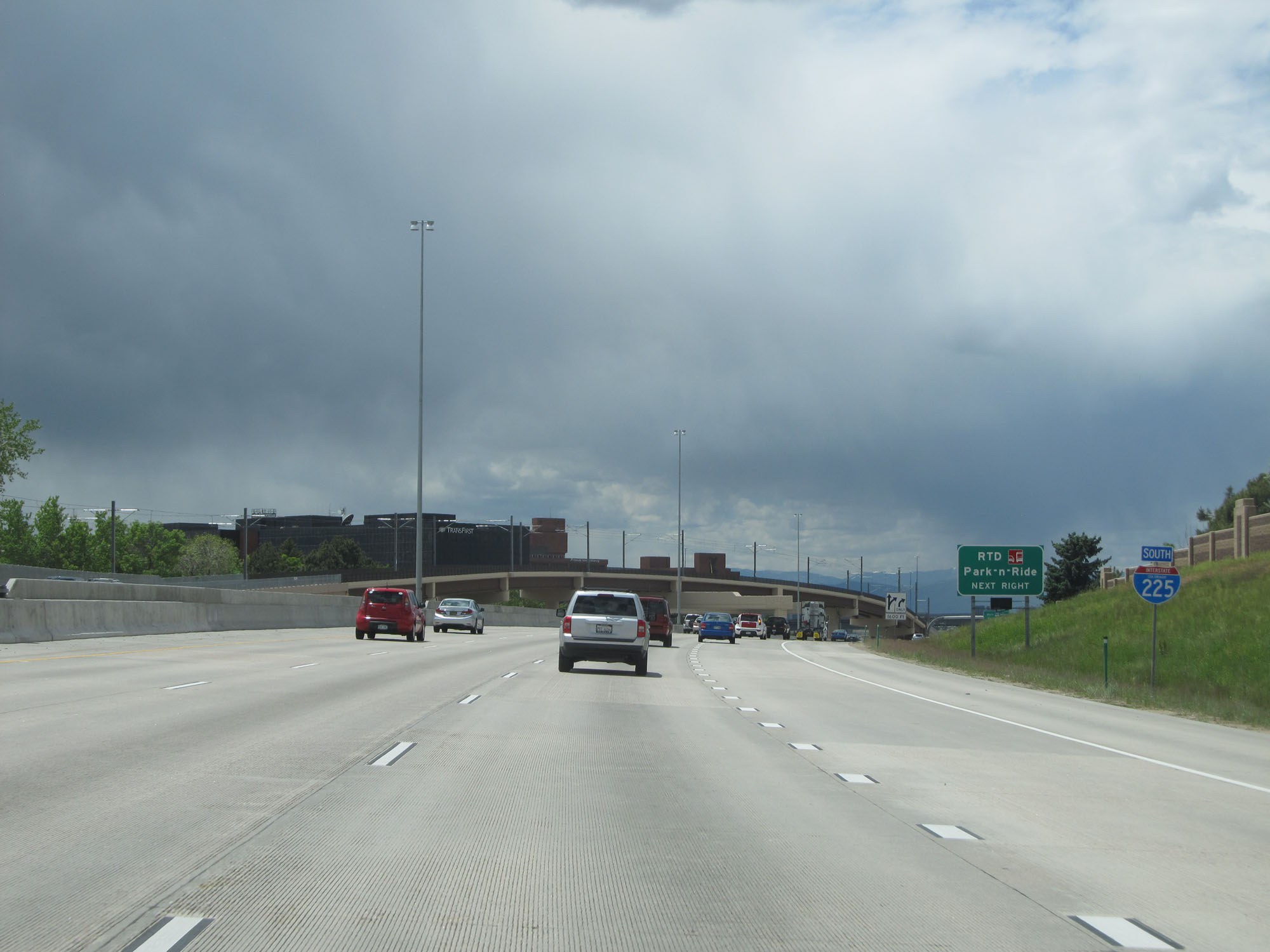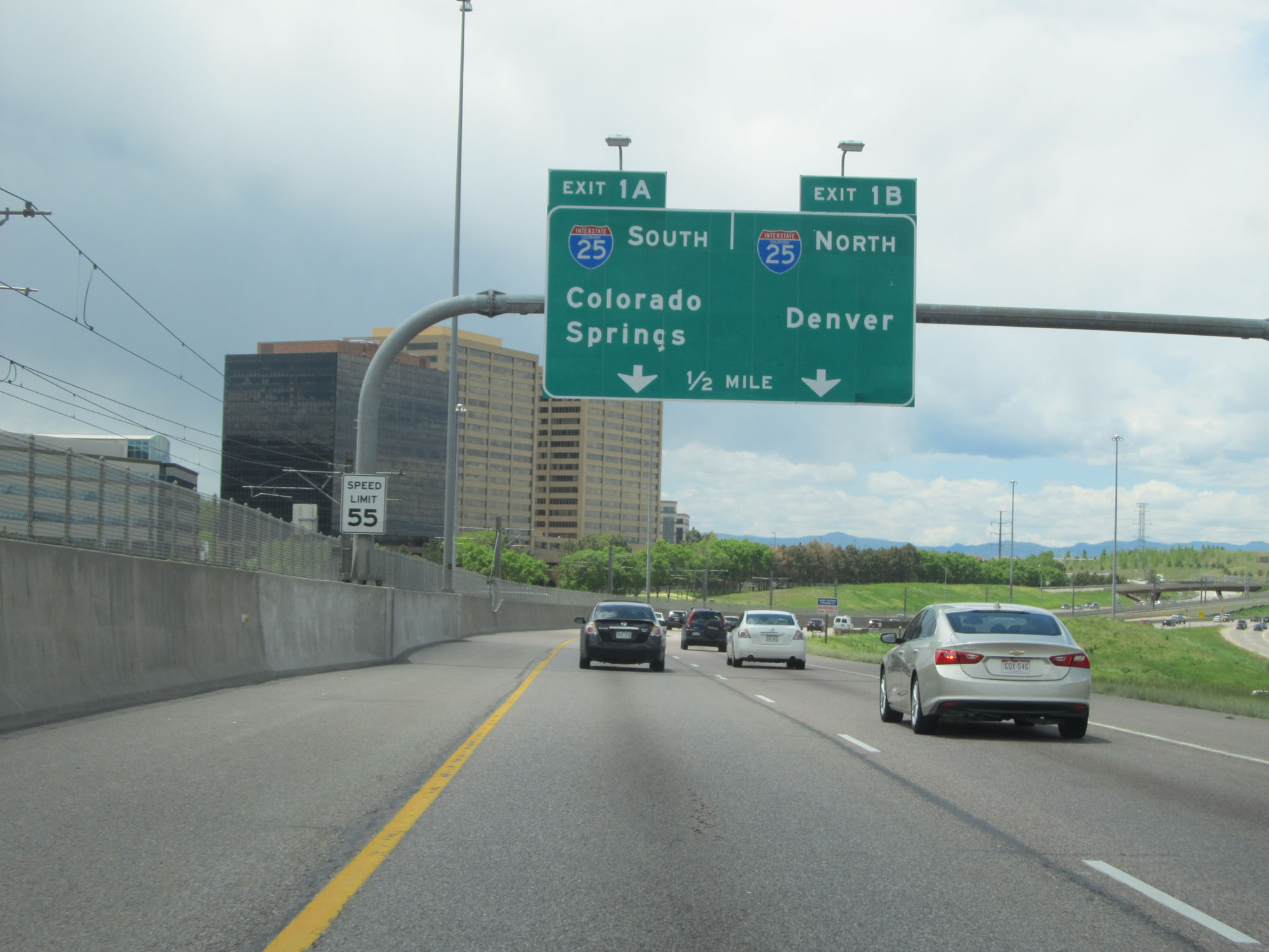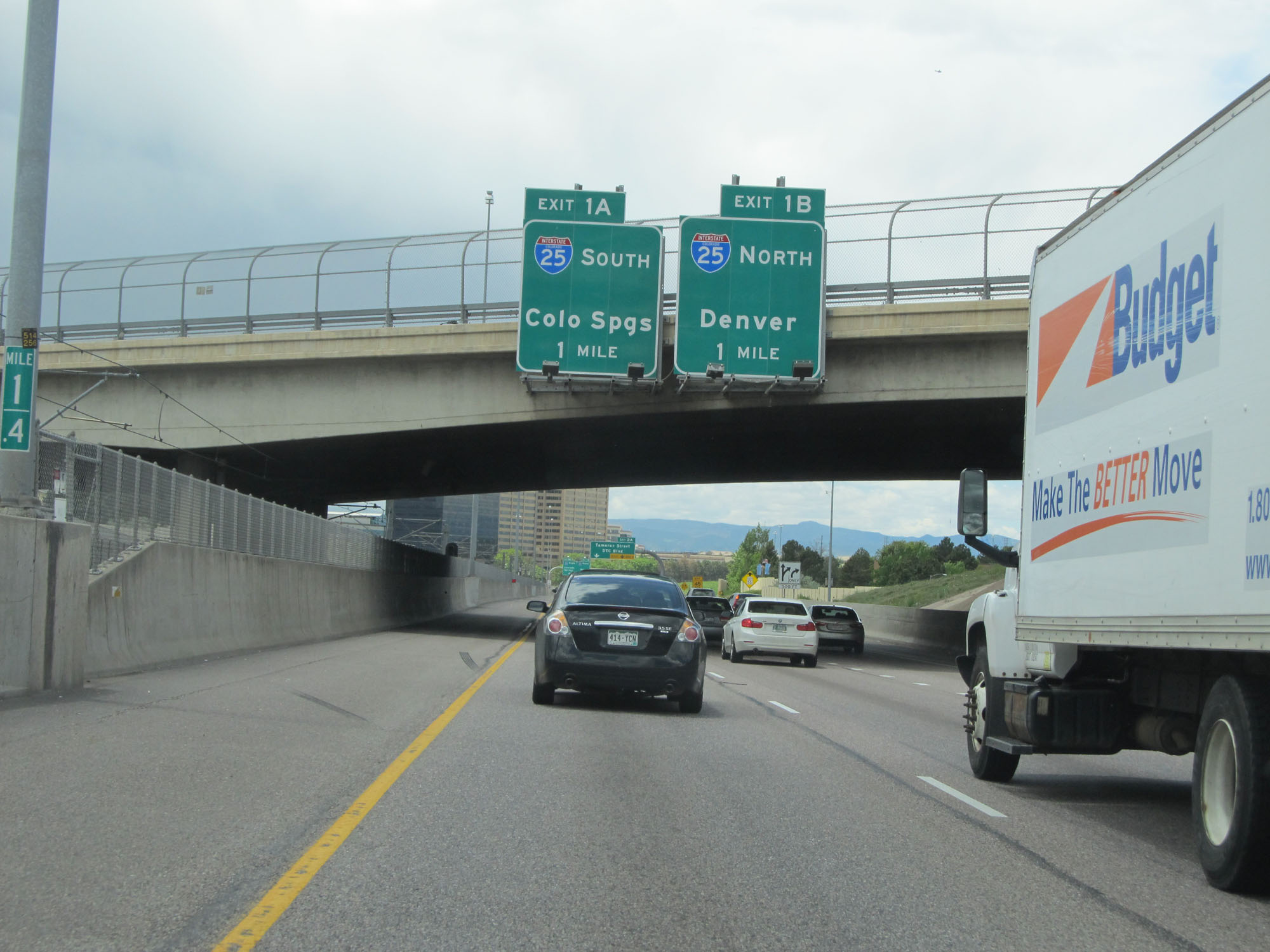 Interstate 225 South at Exit 1B: Interstate 25 North - Denver; Exit 1A: Interstate 25 South - Colorado Springs (Photo taken 5/28/16). |