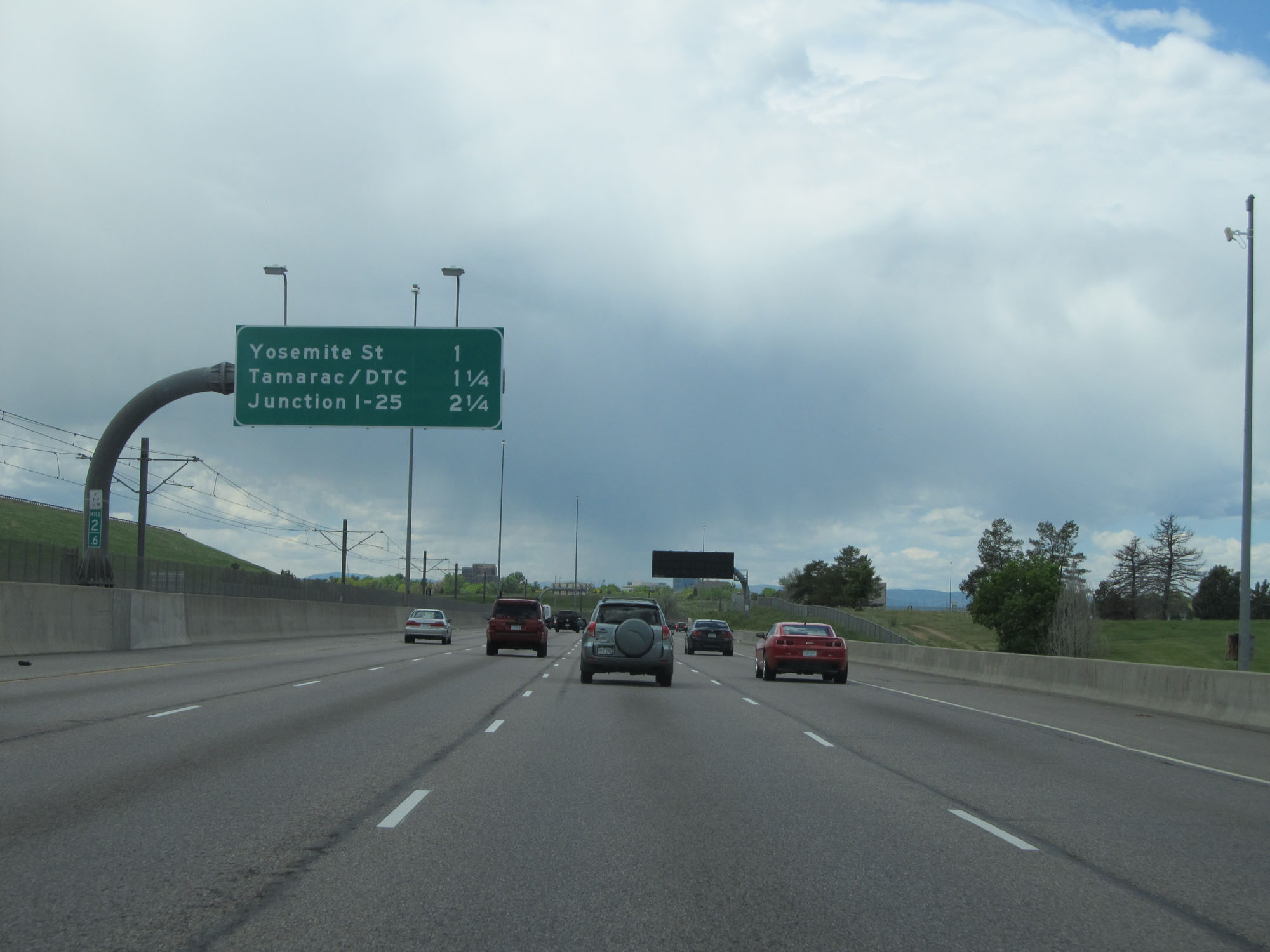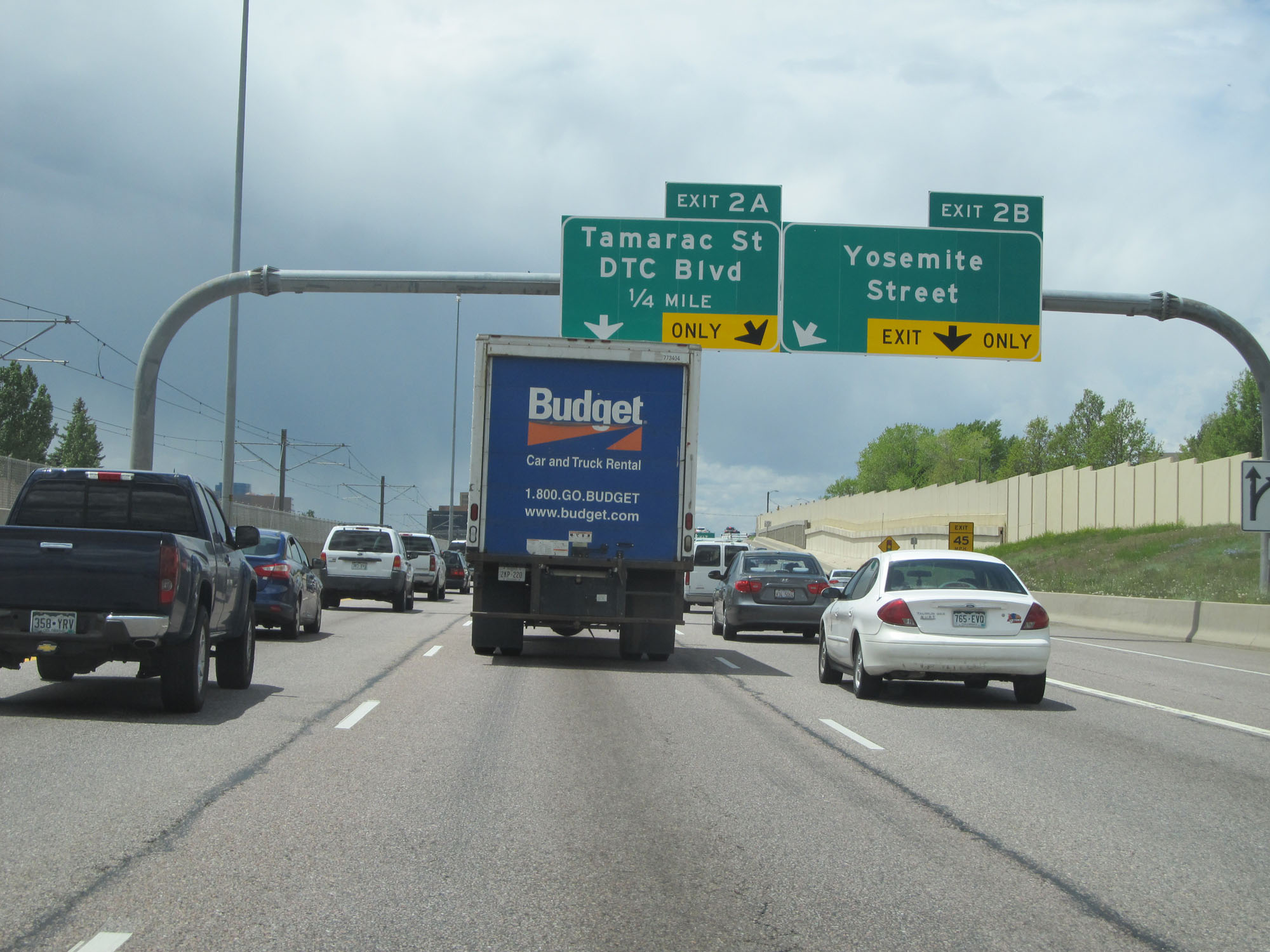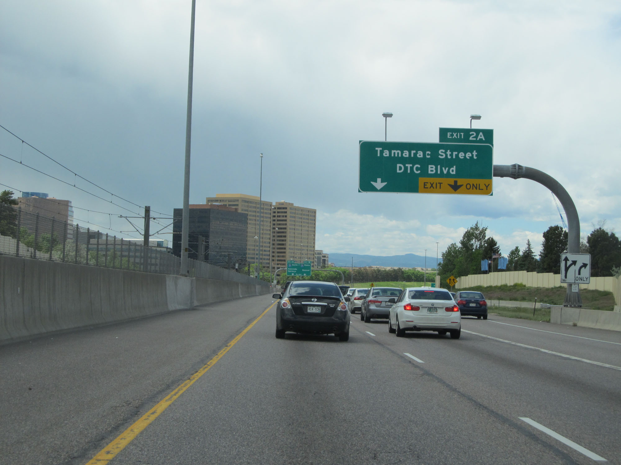 Interstate 225 South at Exit 2A: Tamarac Street / DTC Blvd (Photo taken 5/28/16). |