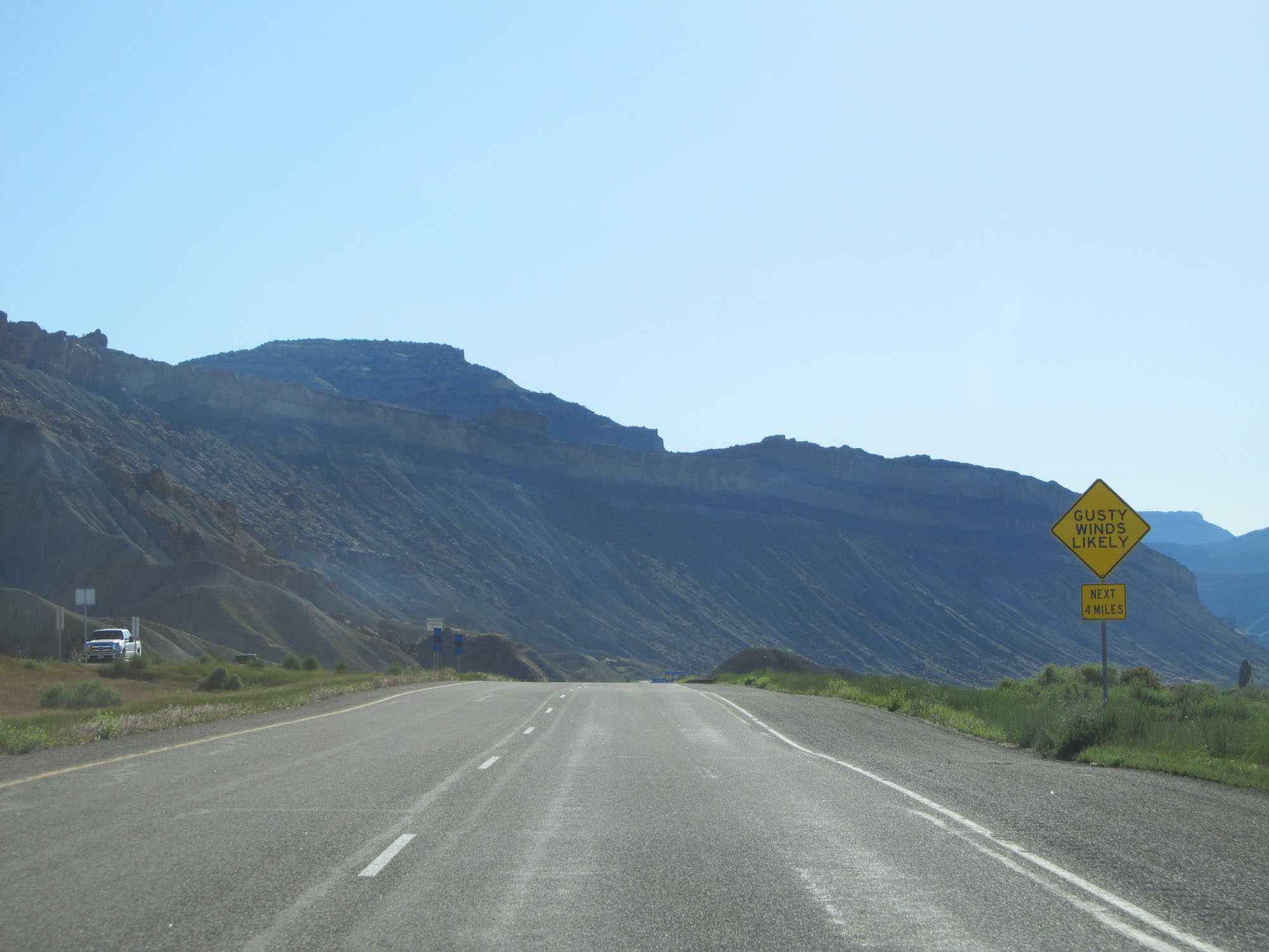 This sign warns trucks of sharp curves ahead as Interstate 70 East prepares to enter Glenwood Canyon. (Photo taken 5/28/16). |