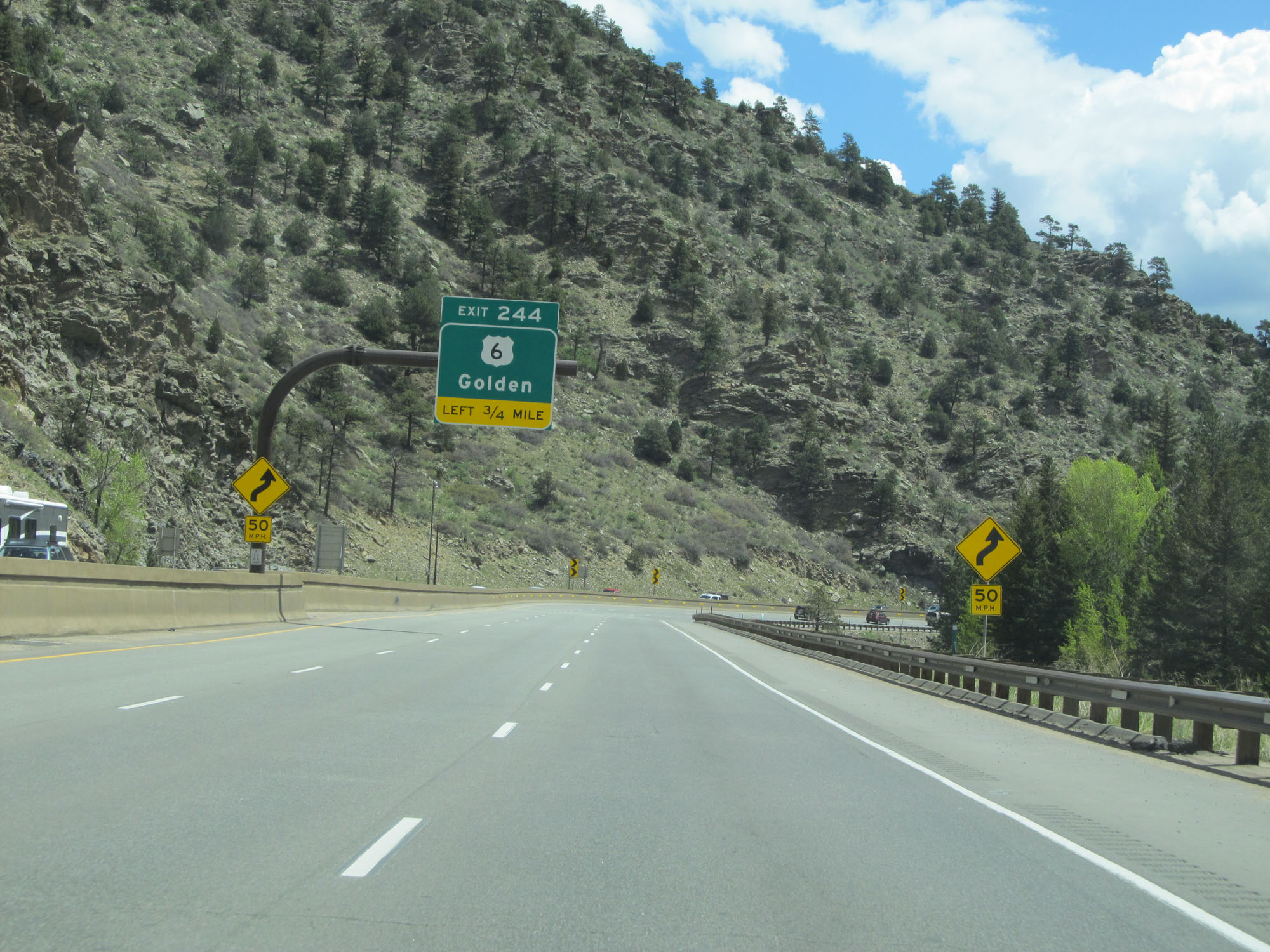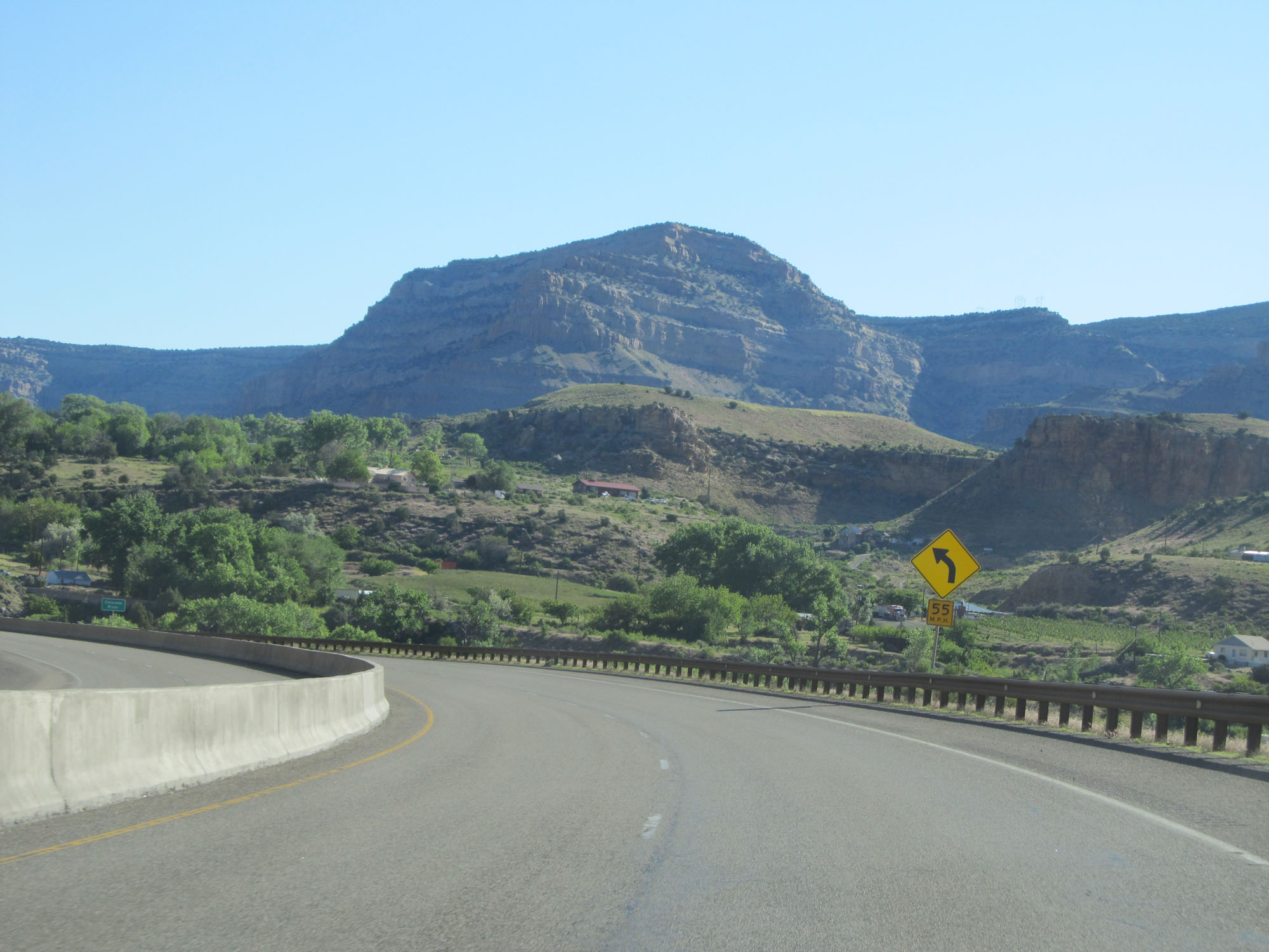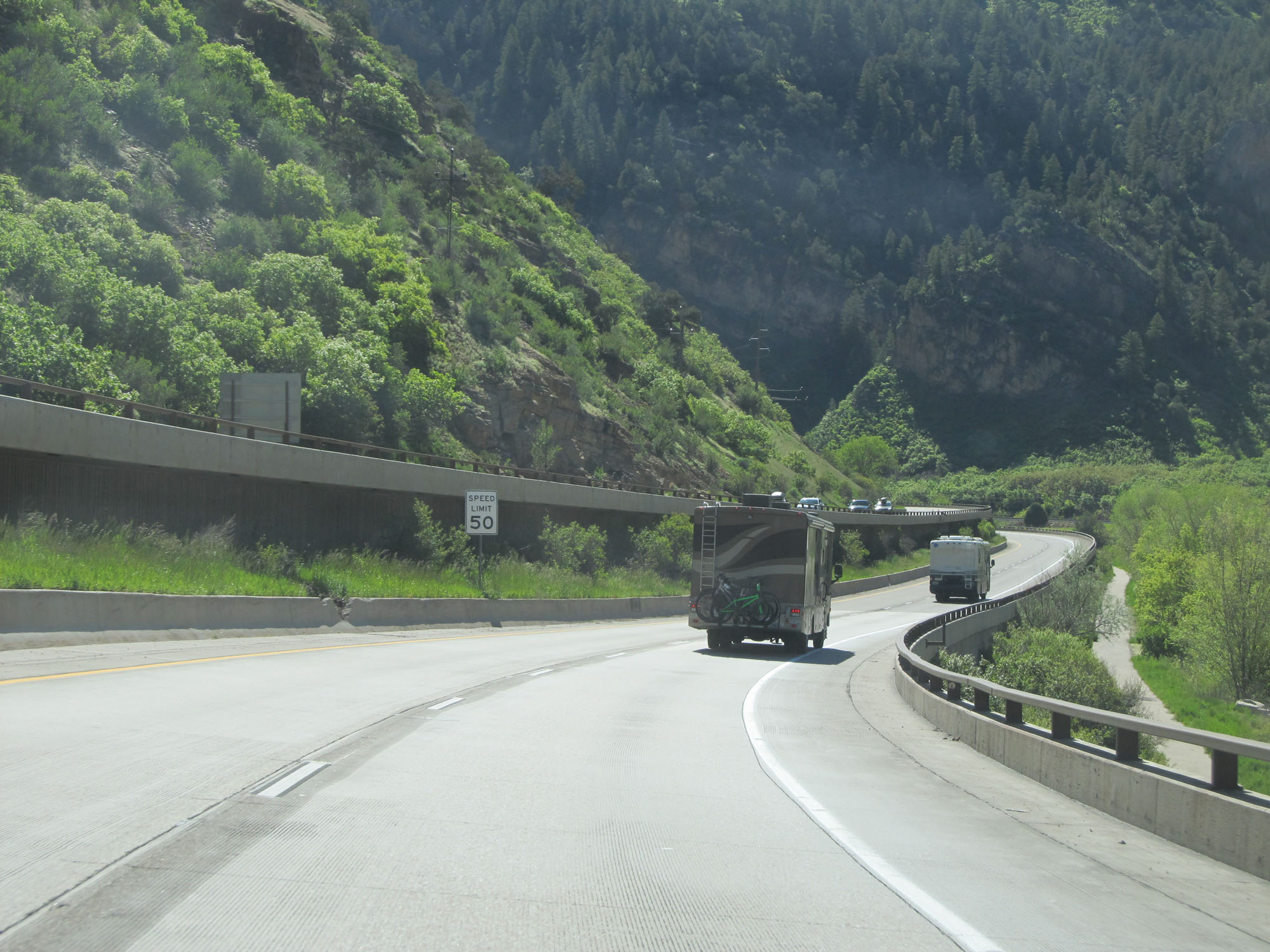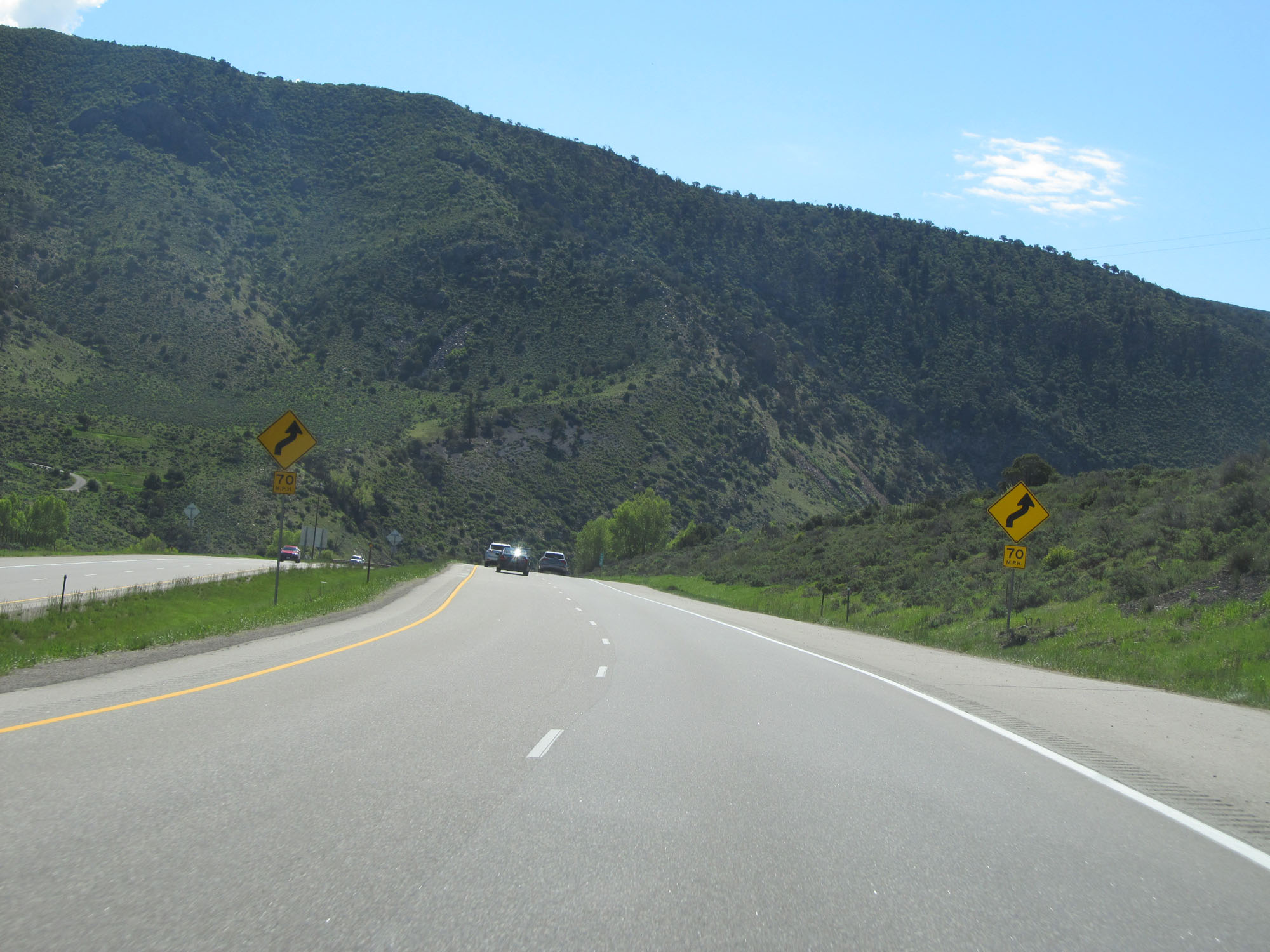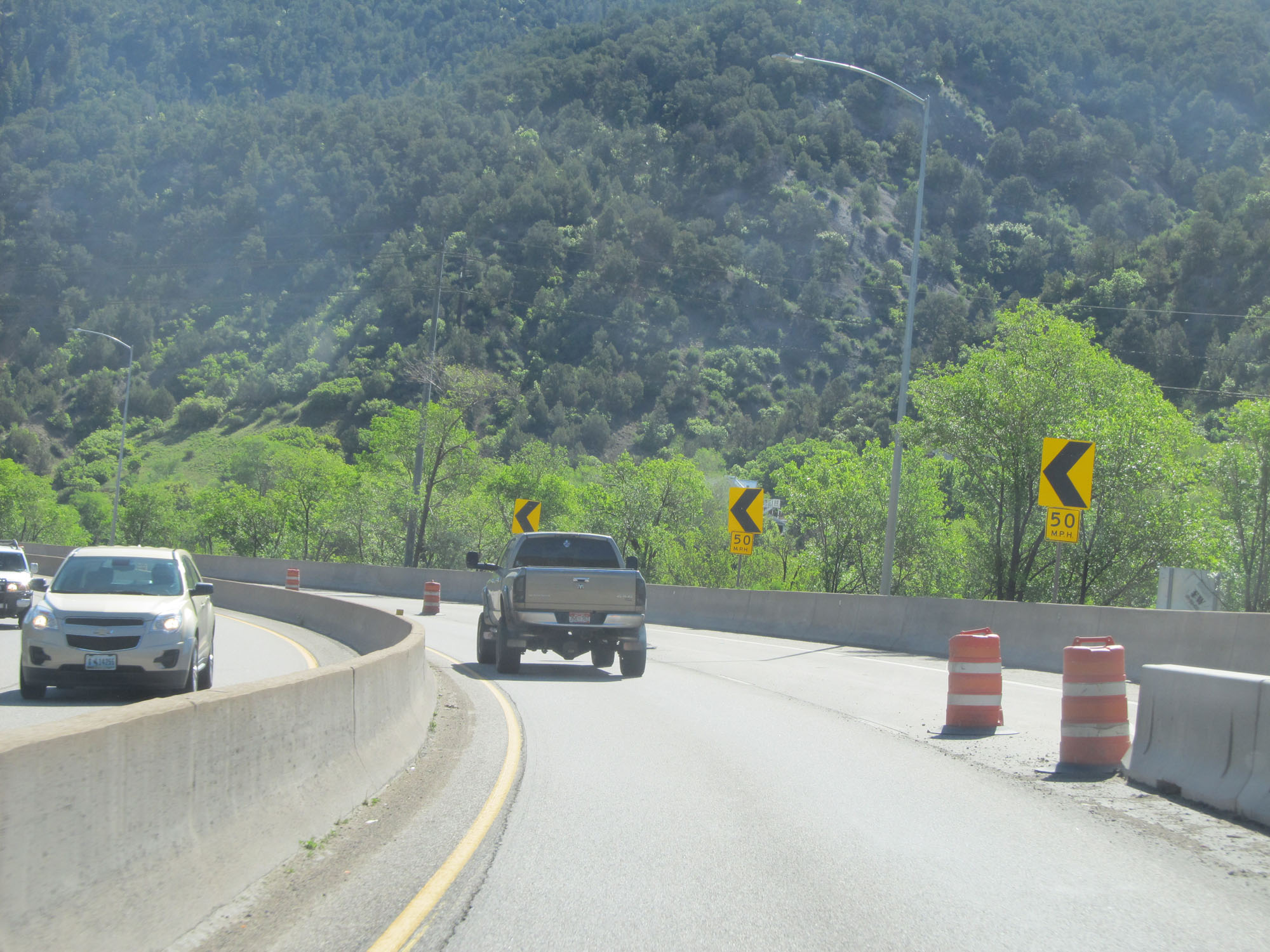 50 mph curve on Interstate 70 East entering Glenwood Canyon. (Photo taken 5/28/16). |