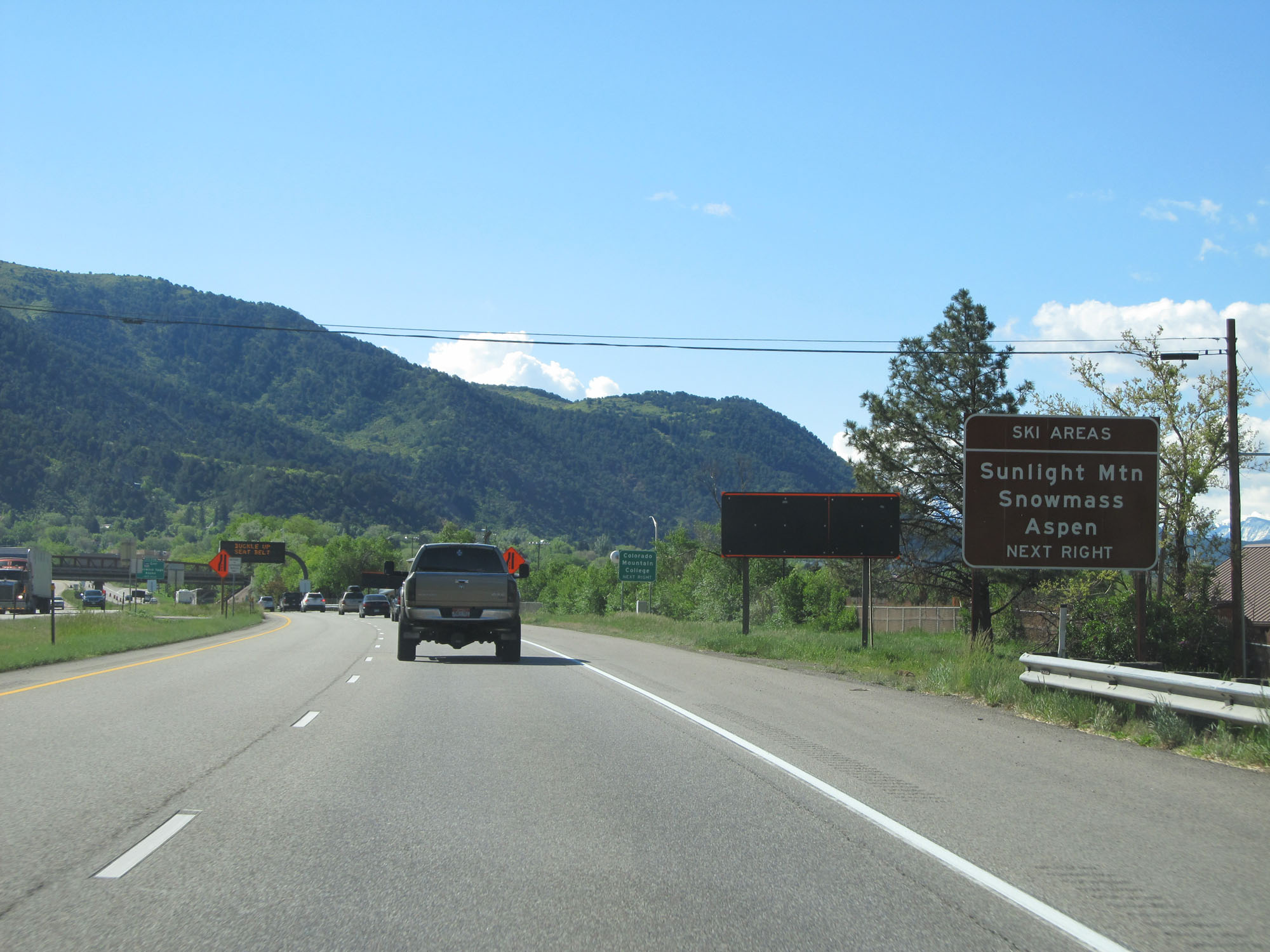 Take Exit 116 to Sunlight Mountain, Snowmass, and Aspen Ski Areas. (Photo taken 5/28/16). |