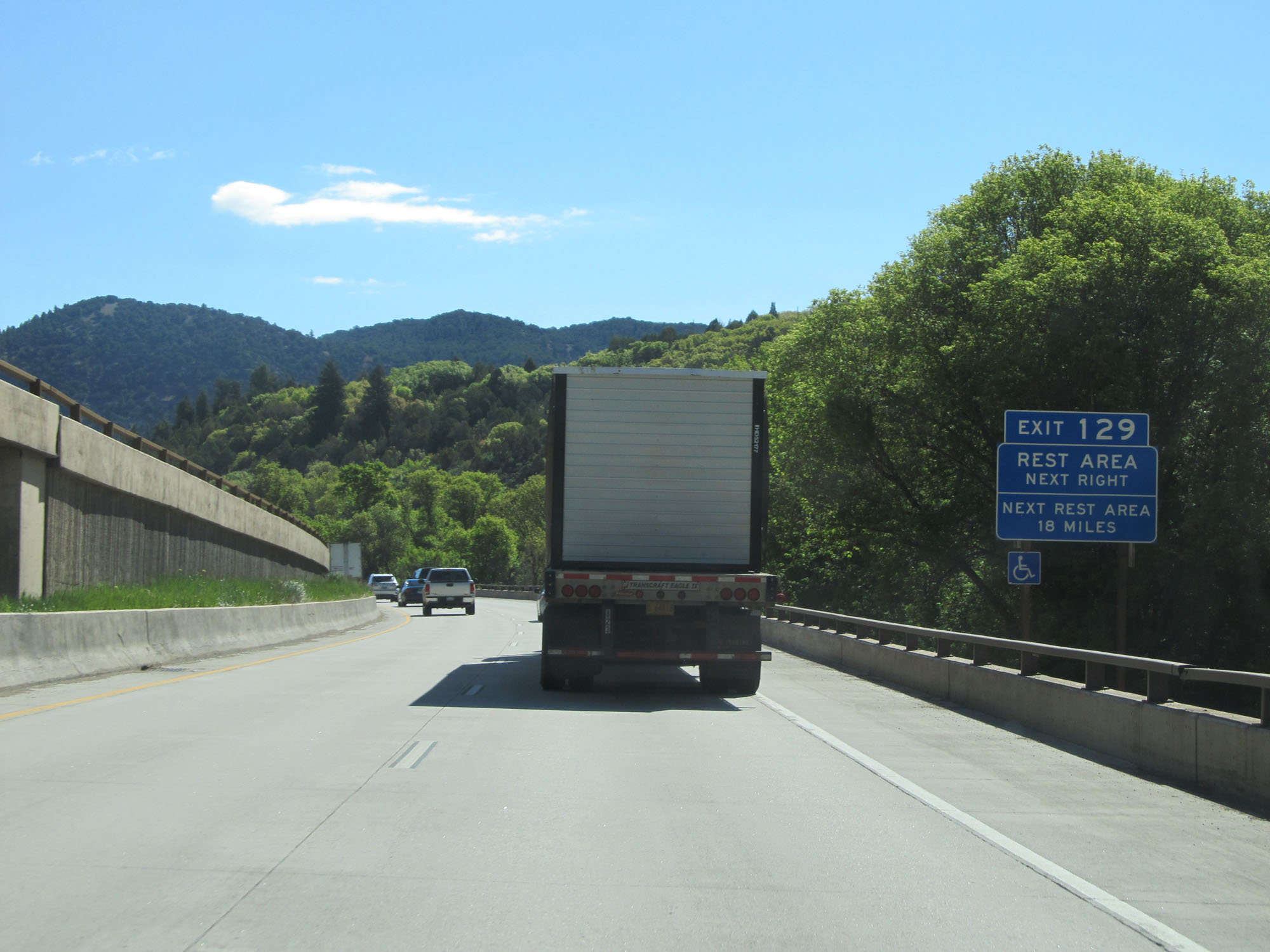 A Rest Area exists off Exit 129 ahead. The next Rest Area beyond this one is 18 miles ahead. (Photo taken 5/28/16). |