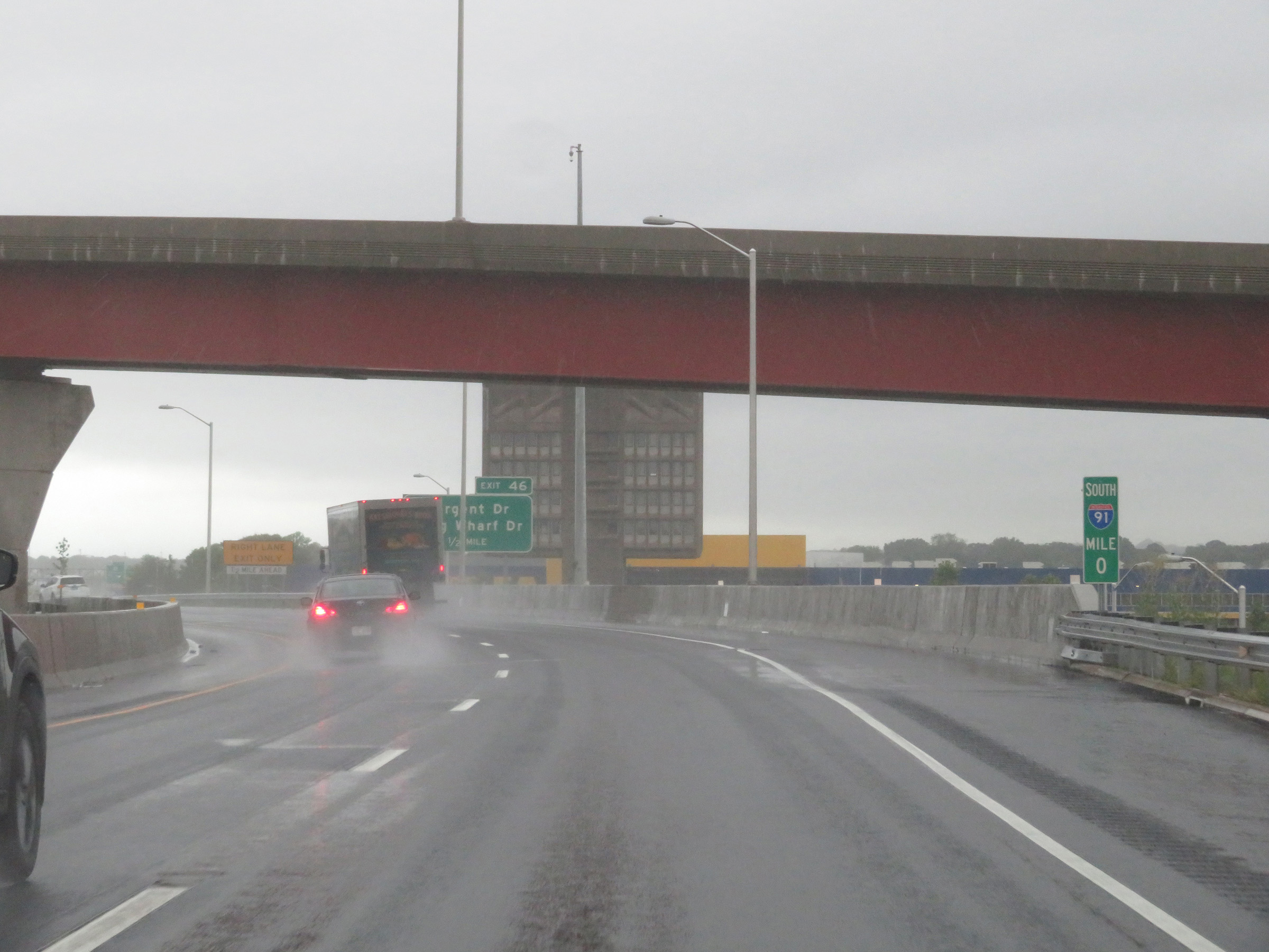Interstate 91 South at mile marker 0, which marks its southern terminus as its two remaining southbound lanes become the ramp to Interstate 95 South in New Haven. (Photo taken 8/5/17). |