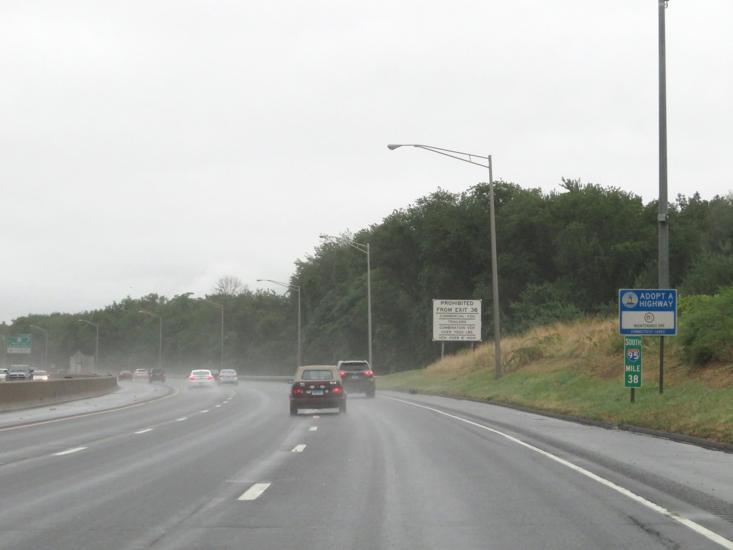 Interstate 95 South approaching Exit 38 - 1/2 mile. Commercial vehicles are prohibited from using Exit 38. (Photo taken 8/5/17). |