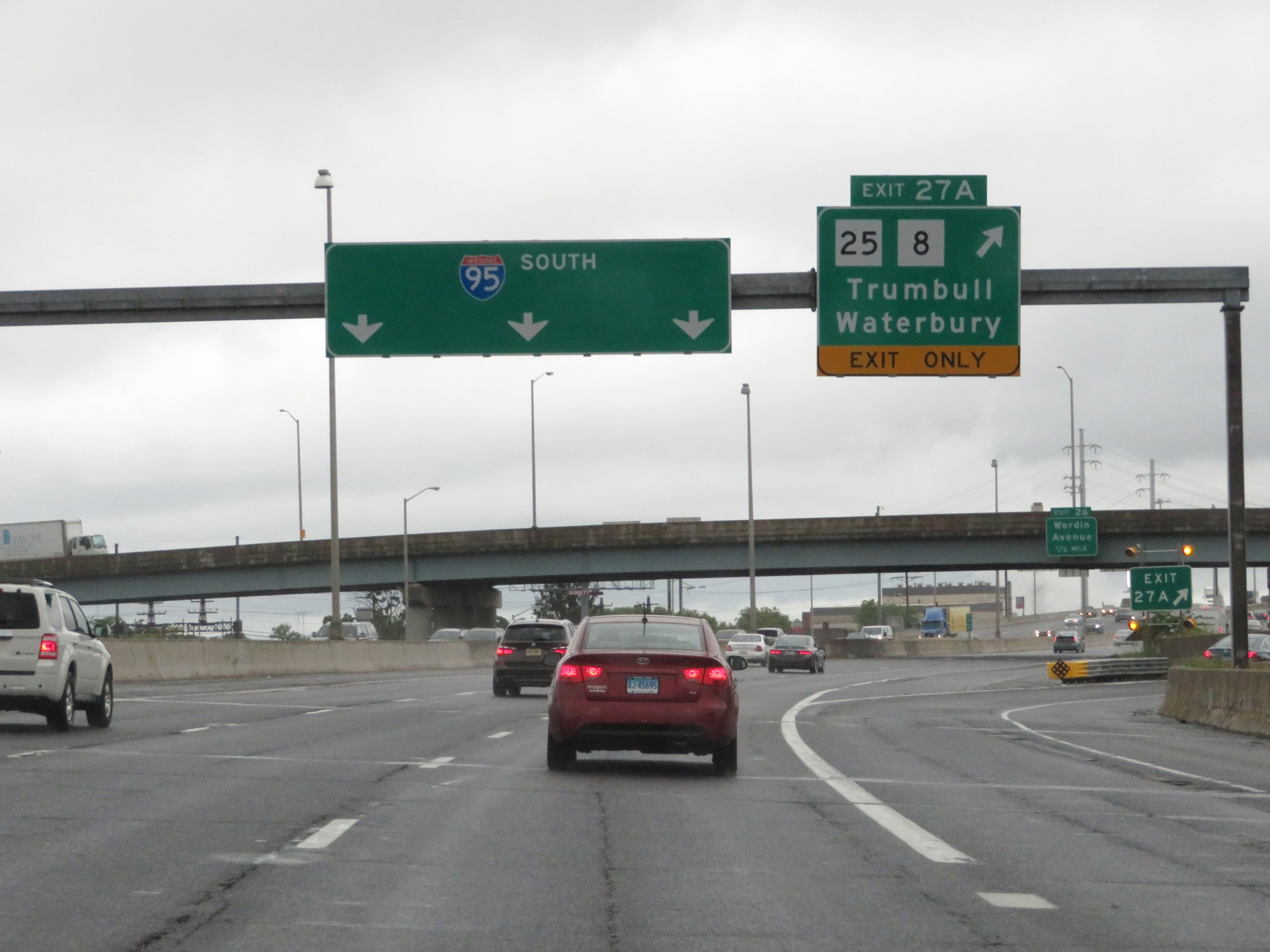 Interstate 95 South at Exit 27A: CT 25 / CT 8 - Trumbull / Waterbury (Photo taken 8/5/17). |