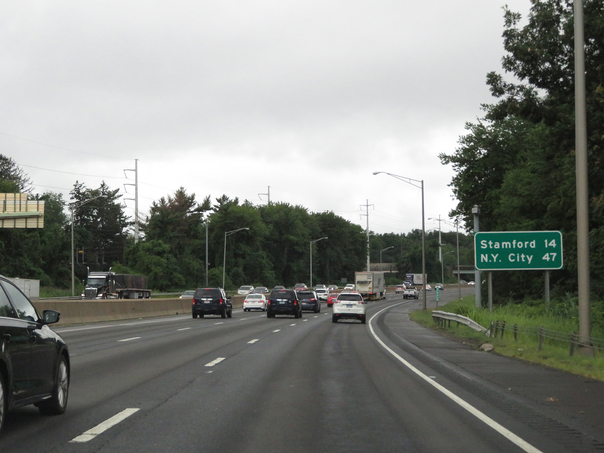 Mileage sign on Interstate 95 South. It's 14 miles to Stamford and 47 miles to New York City. (Photo taken 8/5/17). |