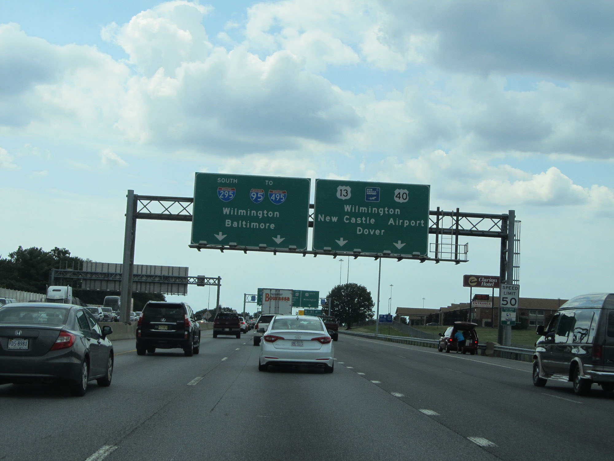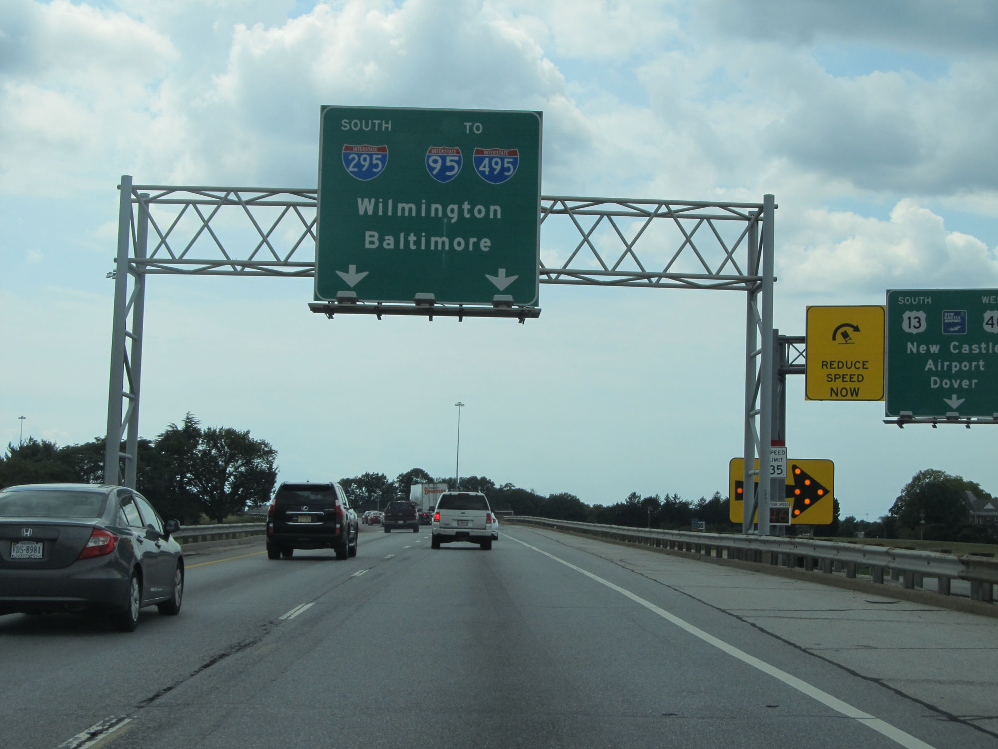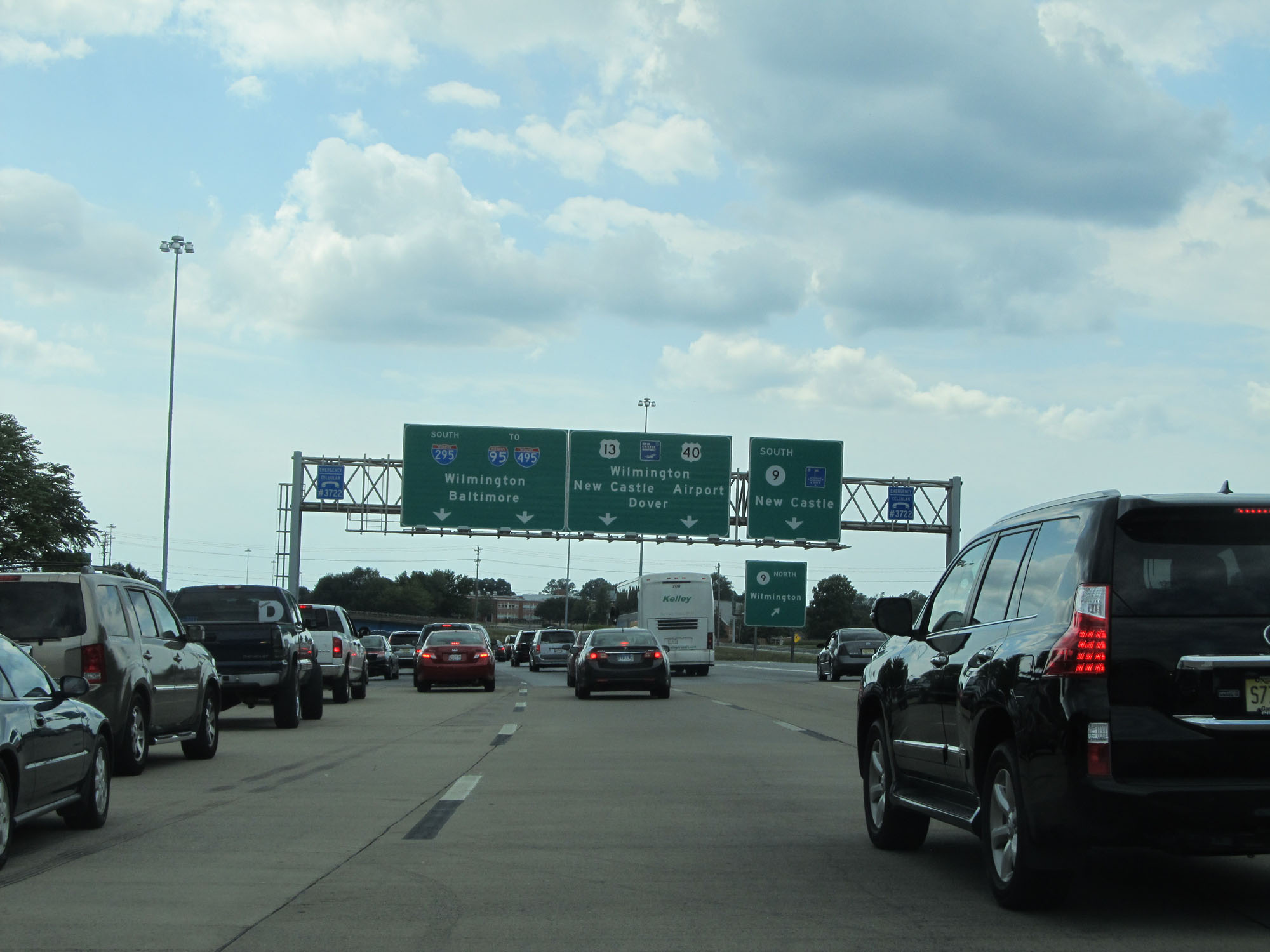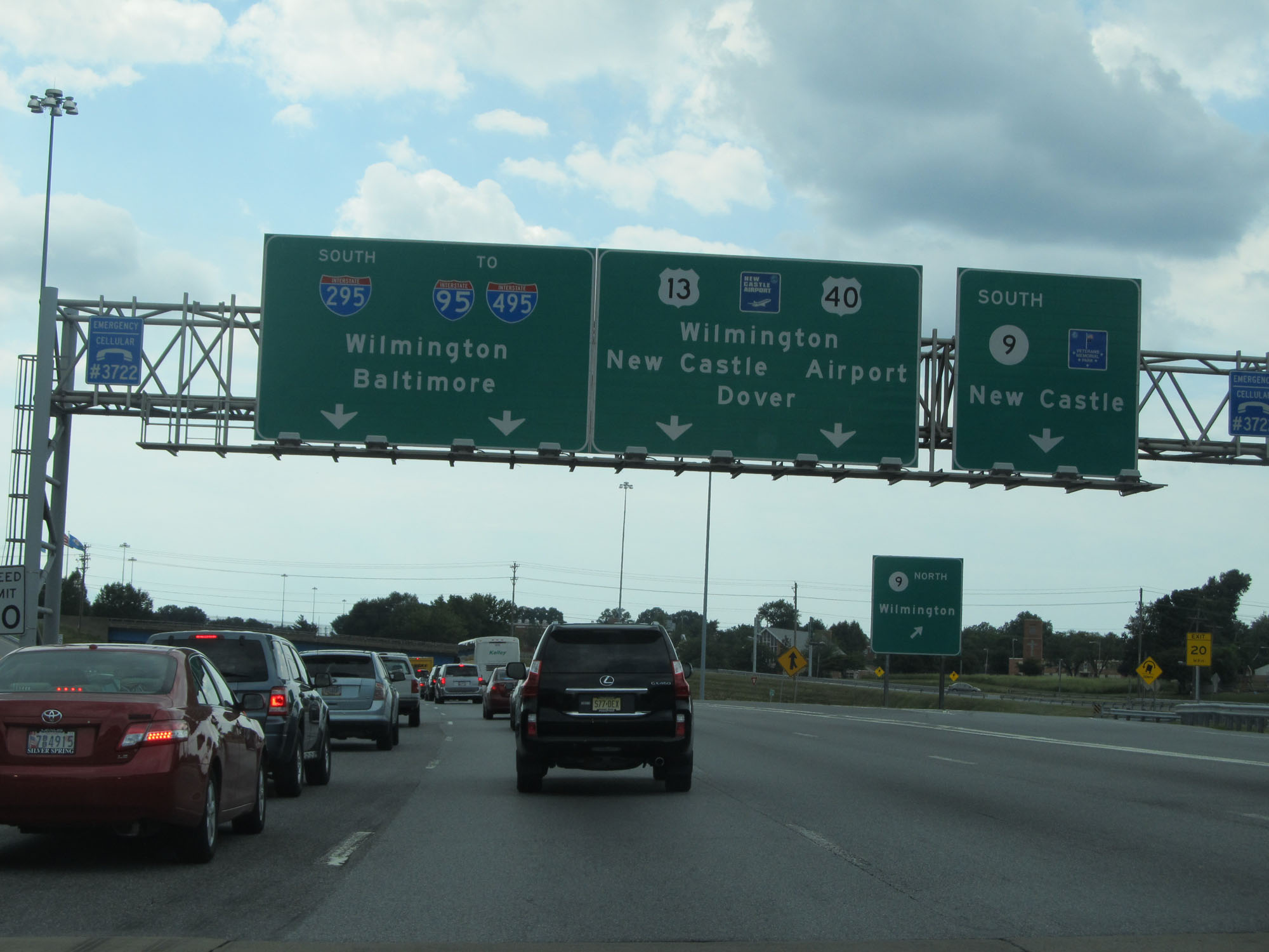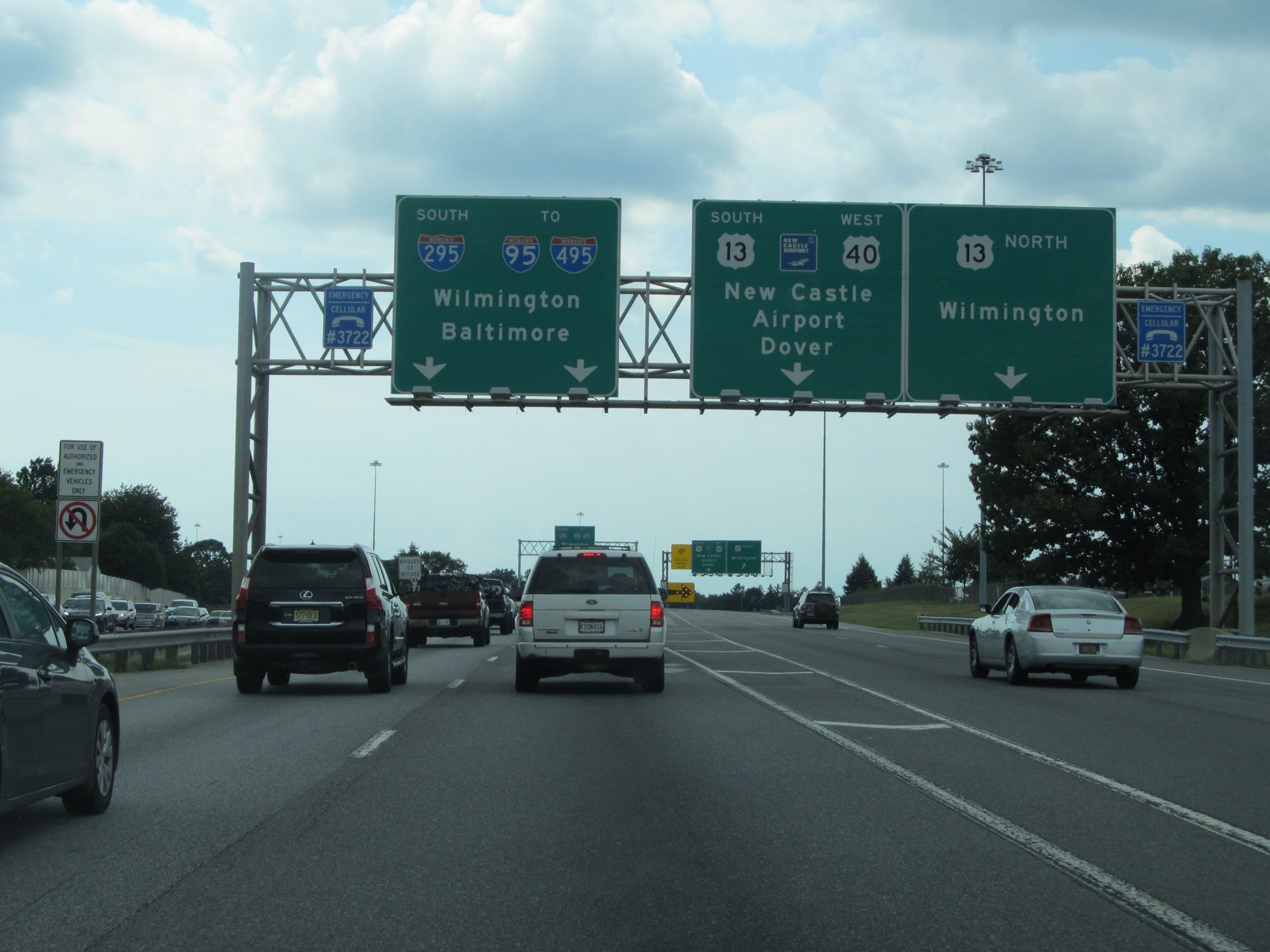 Interstate 295 South at Exit: US 13 North - Wilmington; US 13 South / US 40 West - New Castle / Airport / Dover (Photo taken 8/9/15). |