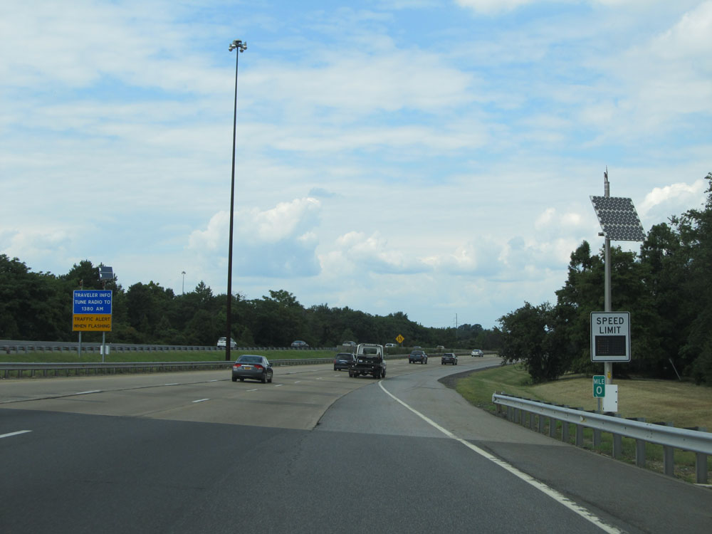 Interstate 495 North as mile marker 0 marks its beginning. We also see an electronic variable speed limit sign here. Variable speed limits are posted along all 12 miles of I-495. (Photo taken 8/9/15).
