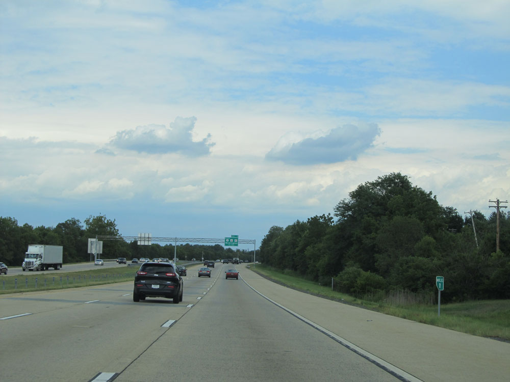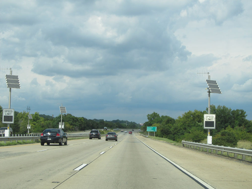 Variable speed limit signs just north of Exit 3. The speed limit at the time I passed through was 65 mph, even though it's hard to see the digits on the signs in this picture. (Photo taken 8/9/15).