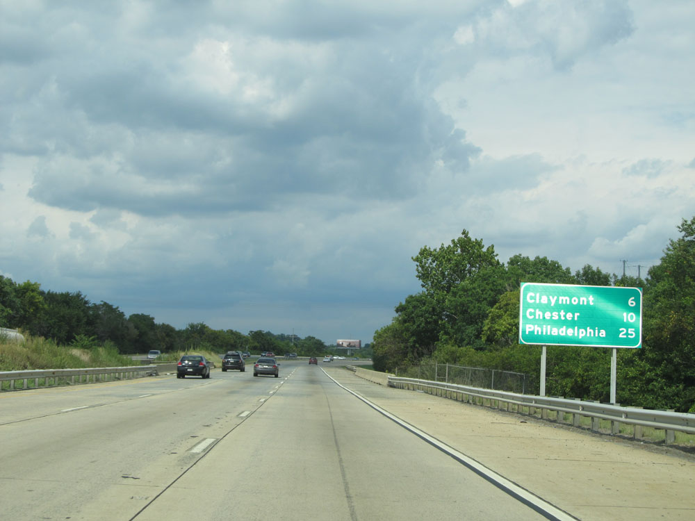 Mileage sign on Interstate 495 North. It's 6 miles to Claymont, 10 miles to Chester, and 25 miles to Philadelphia. (Photo taken 8/9/15).
