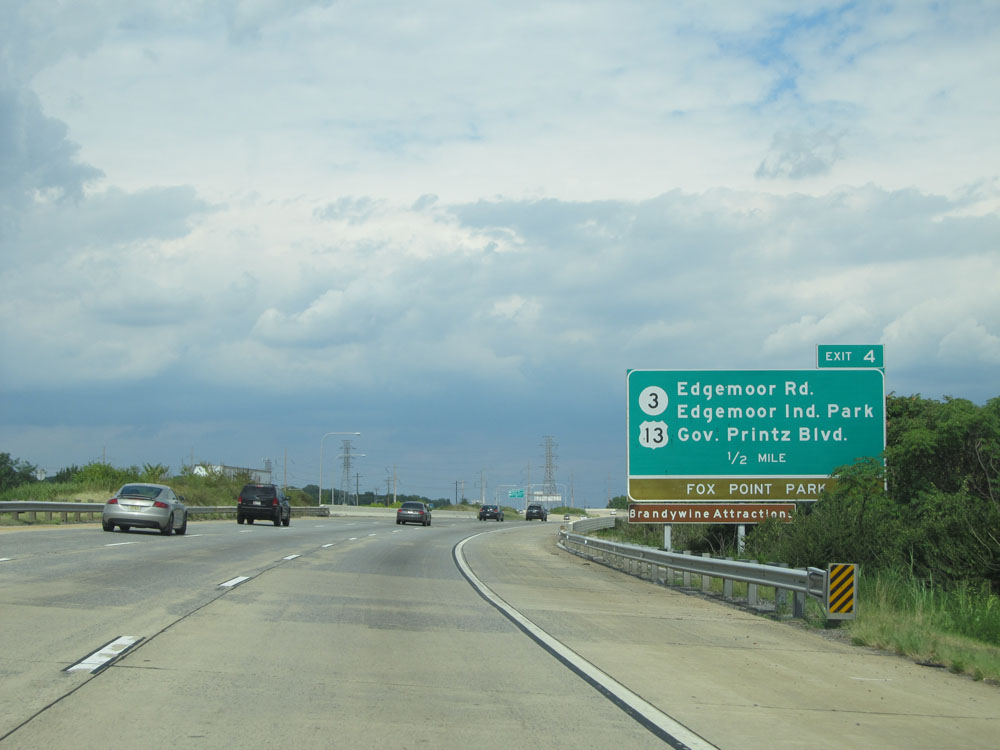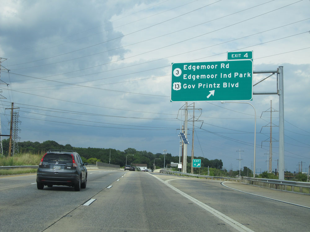 Interstate 495 North at Exit 4: DE 3 / US 13 - Edgemoor Rd / Edgemoor Industrial Park / Gov Printz Blvd (Photo taken 8/9/15).