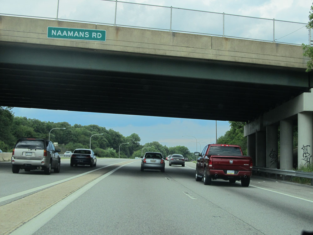 As Interstate 495 North passes under Naamans Rd, we begin to see traffic from Interstate 95 North on the left. (Photo taken 8/9/15).