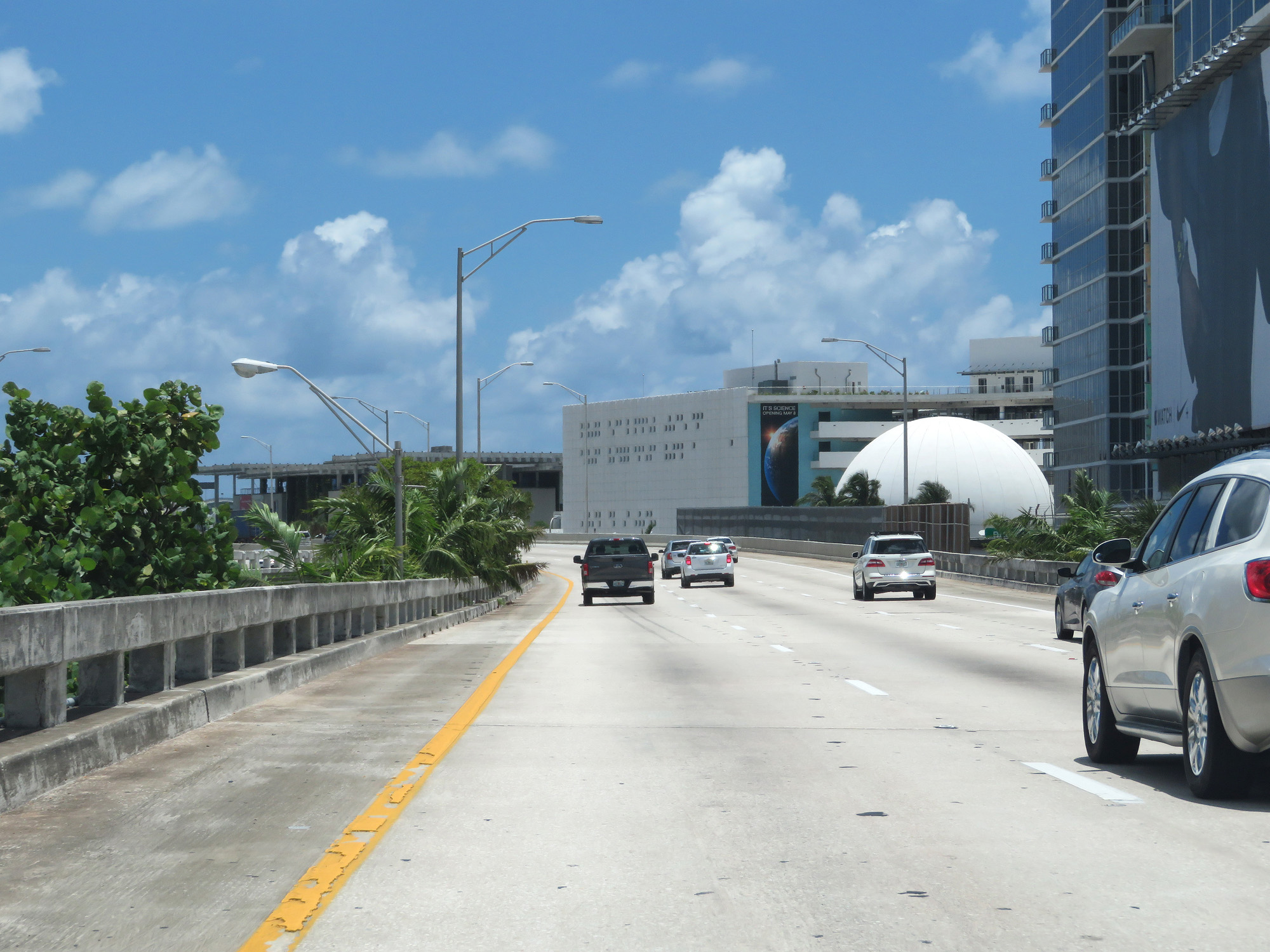 View on Interstate 395 East at its eastern terminus. Seen on the right is the Phillip and Patricia Frost Museum of Science in downtown Miami. (Photo taken 5/22/17). |