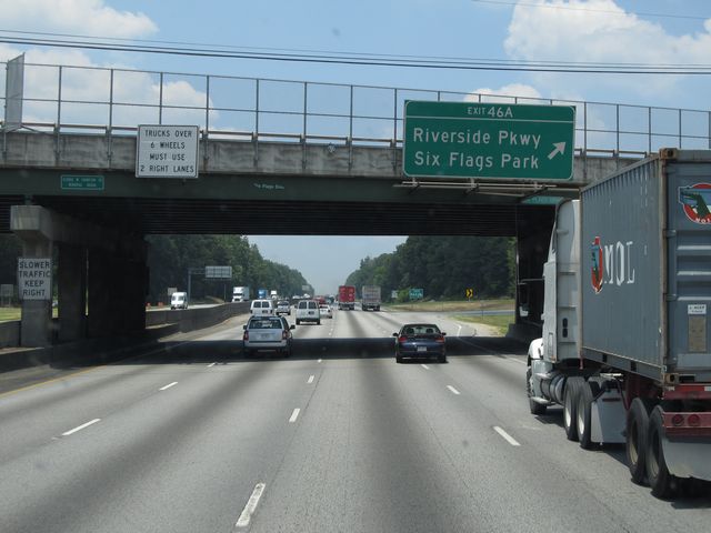Interstate 20 West at Exit 46A: Riverside Pkwy / Six Flags Park. You can also use this exit to get to Six Flags. (Photo taken 6/6/11). |
