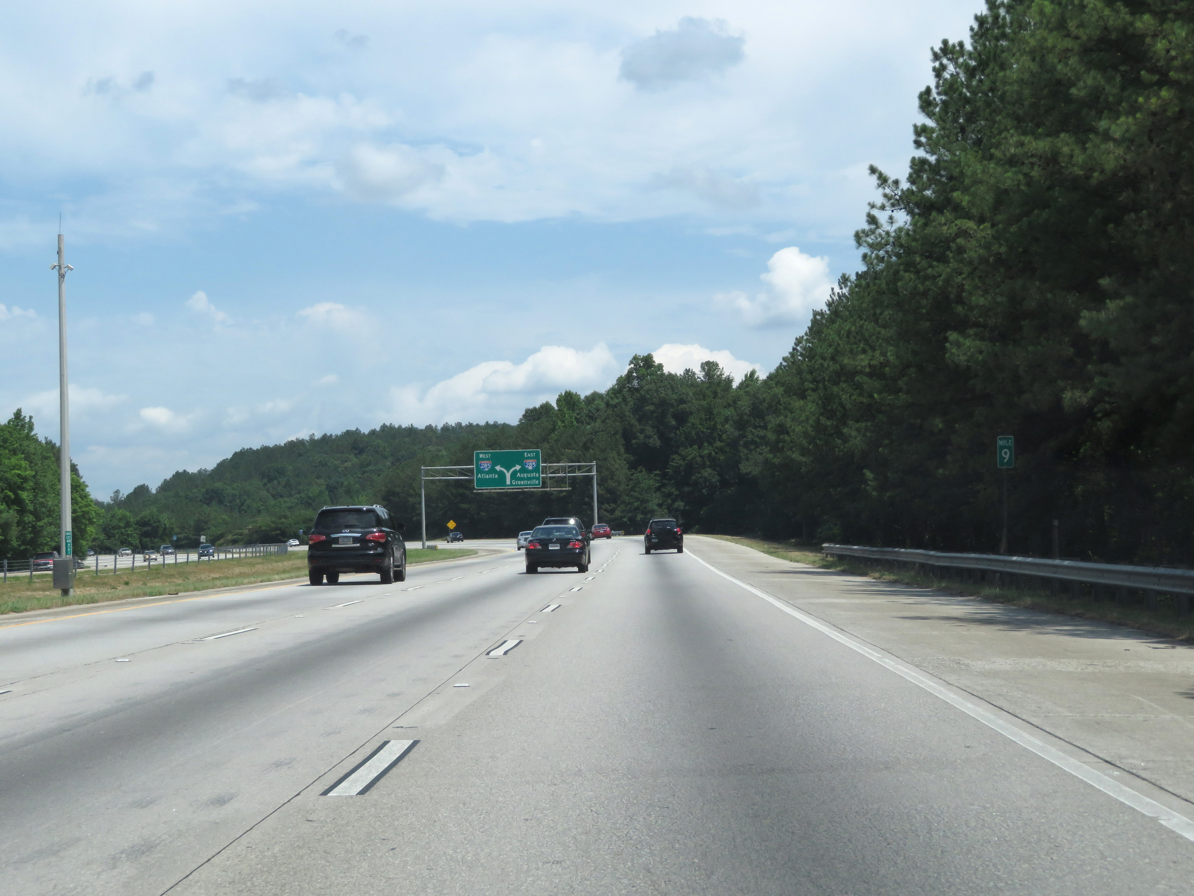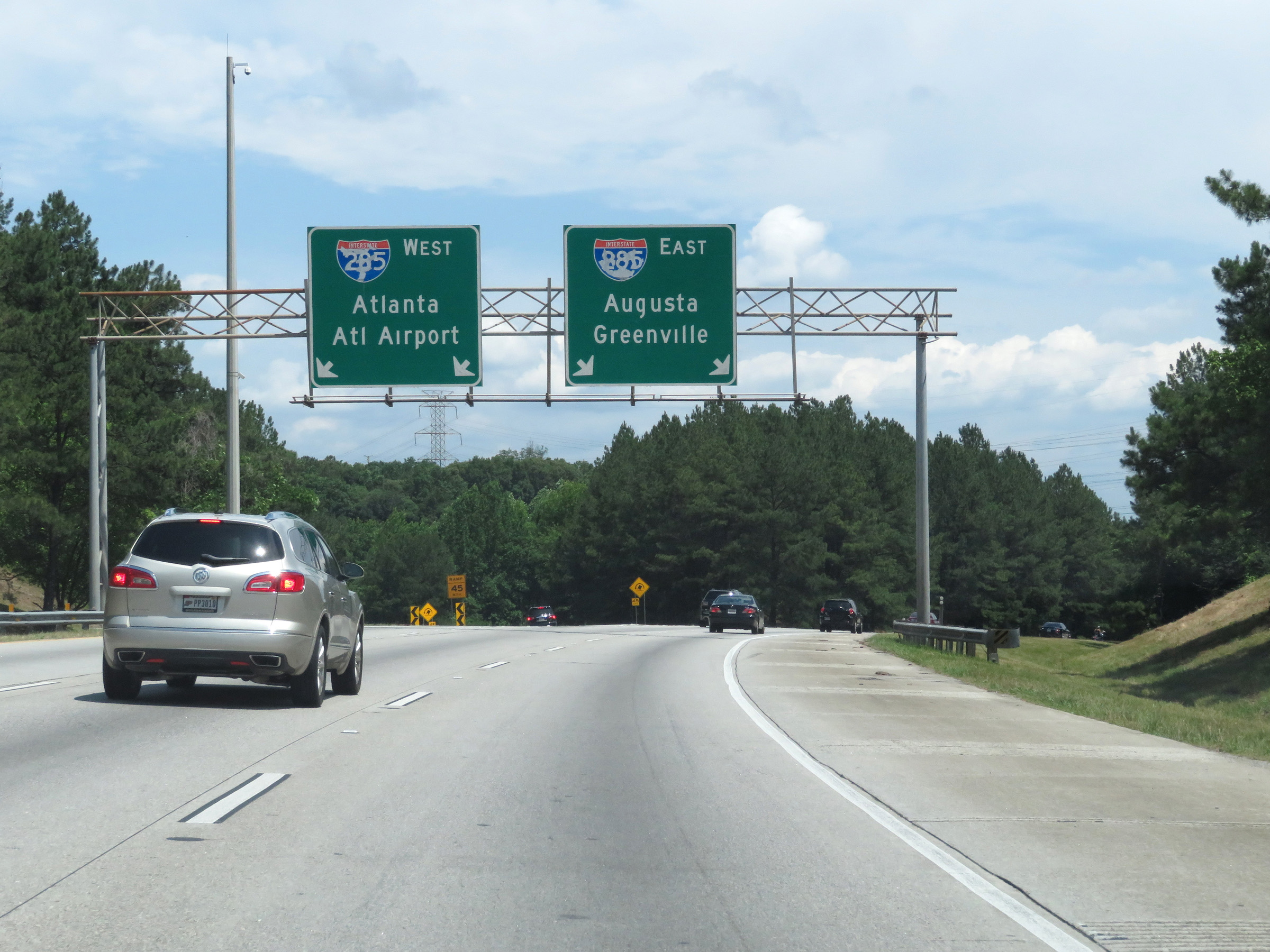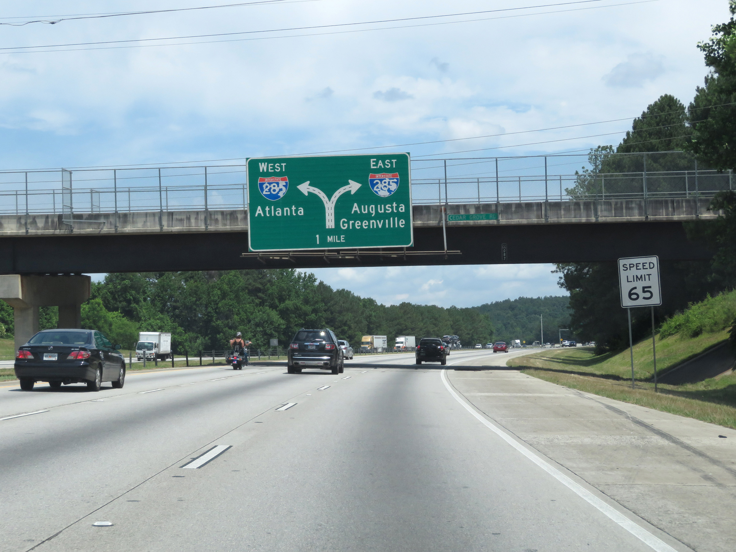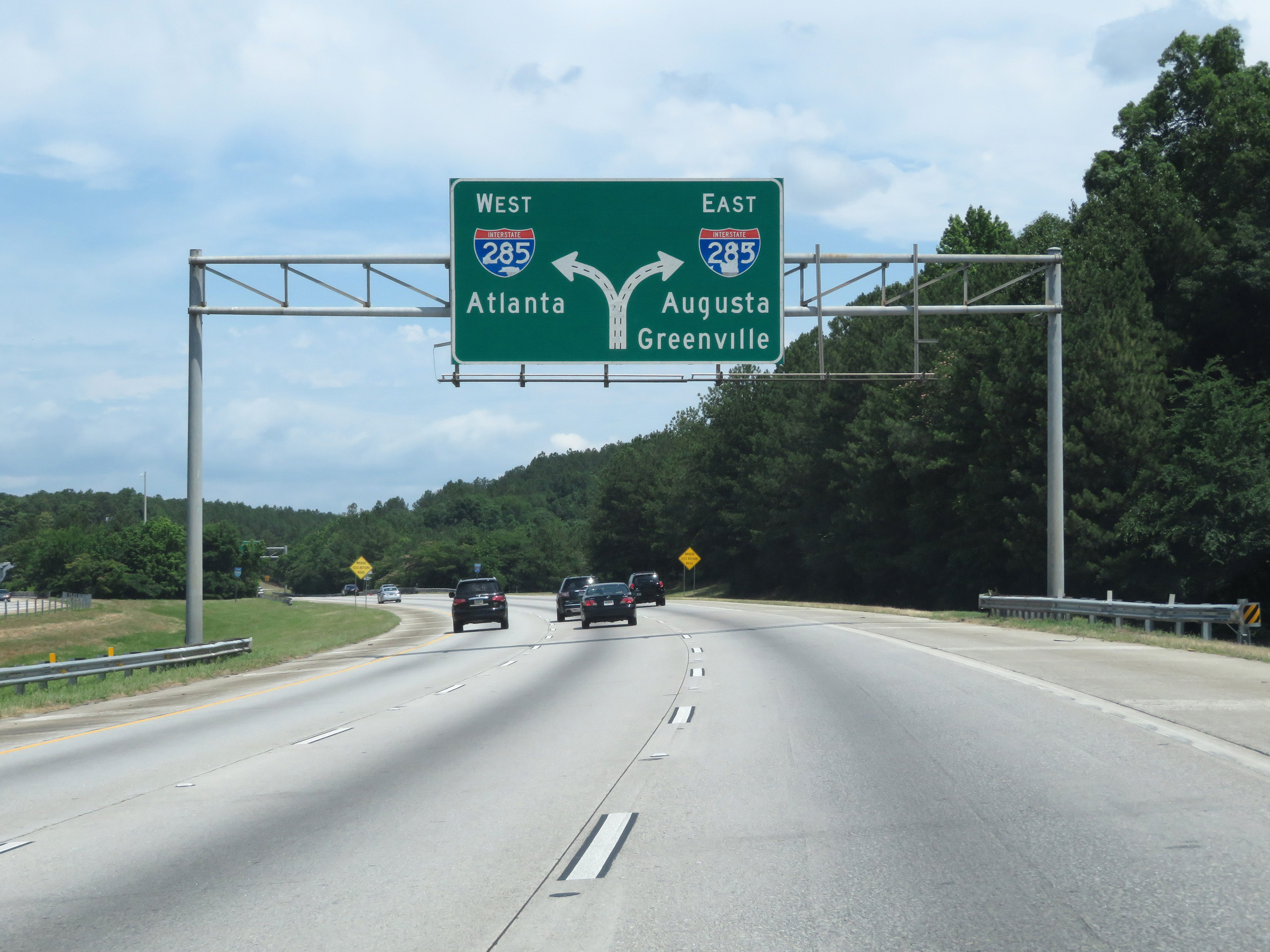 This sign directs traffic to Interstate 20 East toward Augusta and Interstate 85 North toward Greenville to keep right and use Interstate 285 East. (Photo taken 5/27/17). |