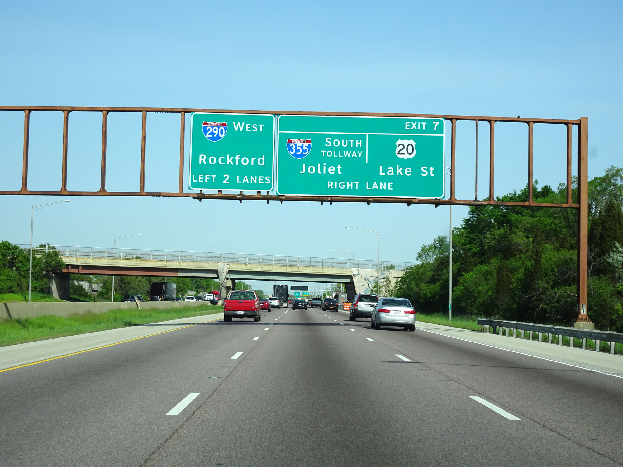 Interstate 290 West at Exit 7: Interstate 355 South - Joliet / US 20 - Lake St (Photo taken 5/21/16). |