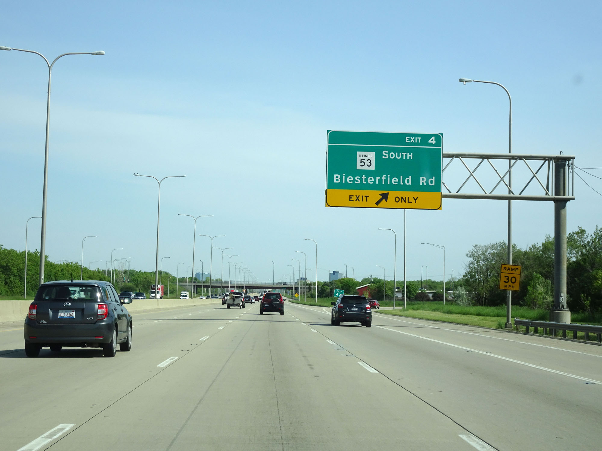 Interstate 290 West at Exit 4: IL 53 South - Biesterfield Rd (Photo taken 5/21/16). |