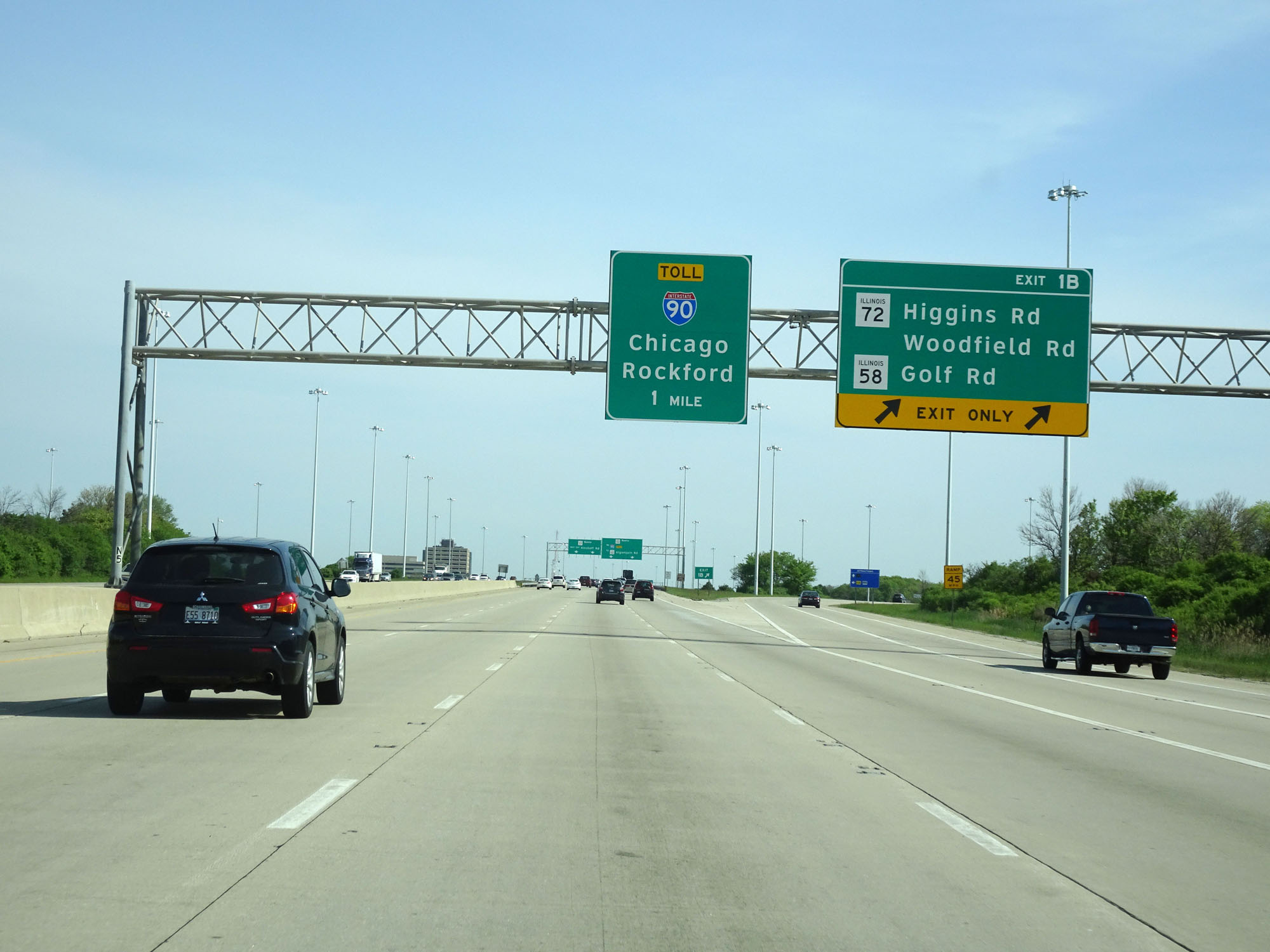 Interstate 290 West at Exit 1B: IL 72 - Higgins Rd / Woodfield Rd; IL 58 - Golf Rd (Photo taken 5/21/16). |
