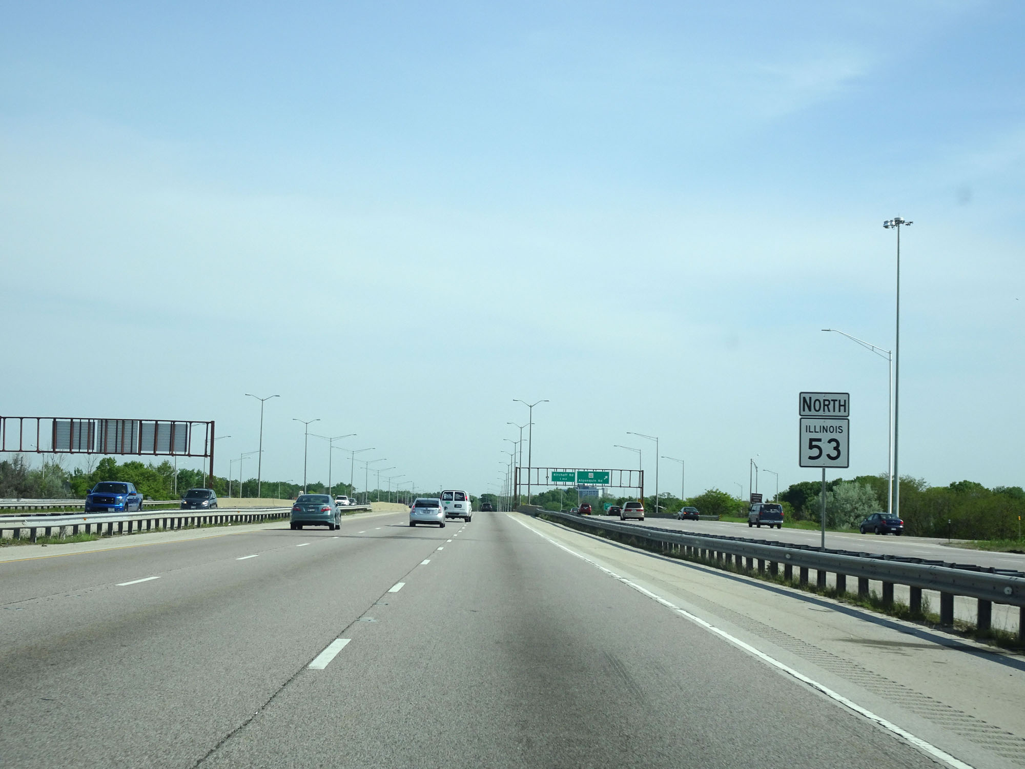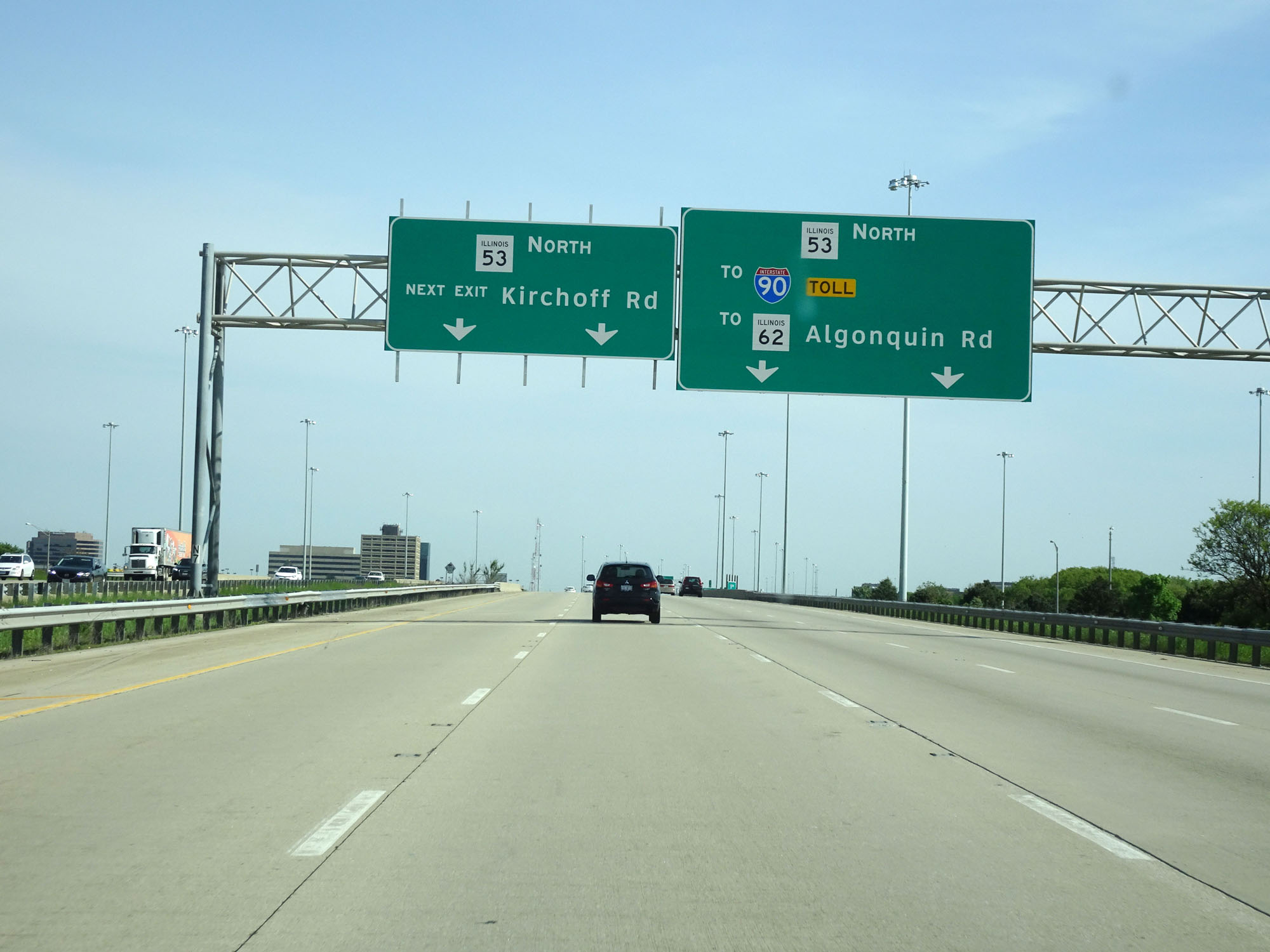 Once Interstate 290 West ends ahead at Interstate 90, IL 53 North will take over. The first exit on IL 53 North will be Kirchoff Rd. (Photo taken 5/21/16). |