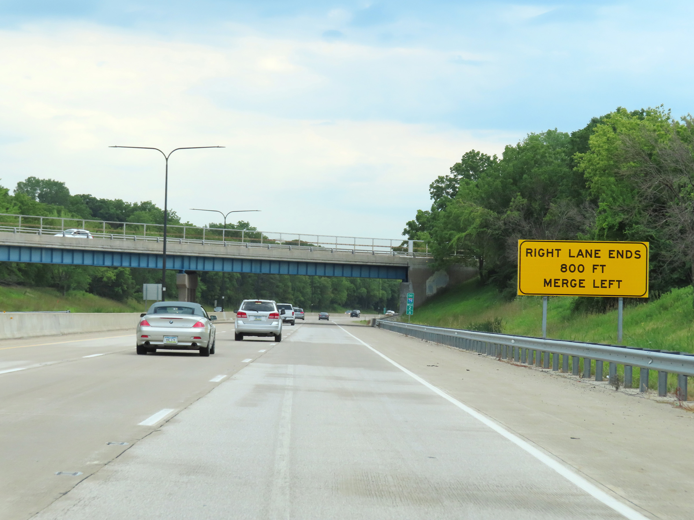 This sign at mile marker 2.6 warns that the right lane will come to an end ahead, and Interstate 74 East will be reduced to two thru lanes. (Photo taken 8/19/22). |