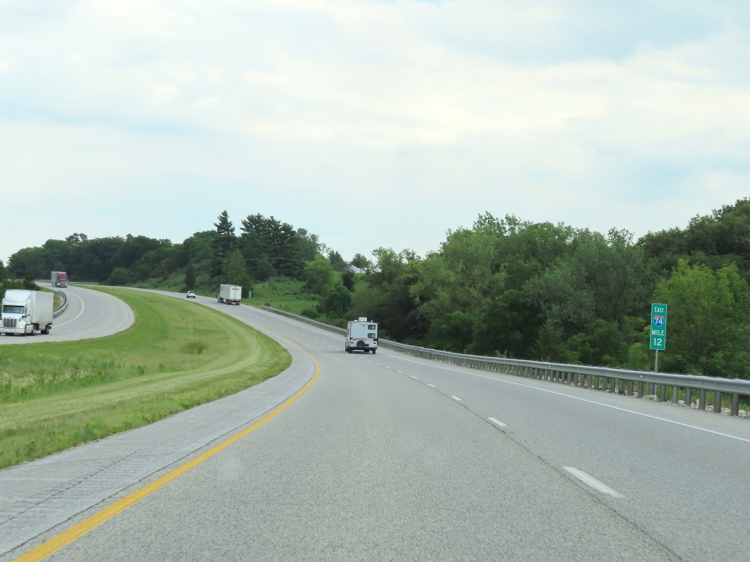 Interstate 74 East at mile marker 14.2, as traffic from Interstate 80 East joins its current single lane ramp from the left. (Photo taken 8/20/22). |