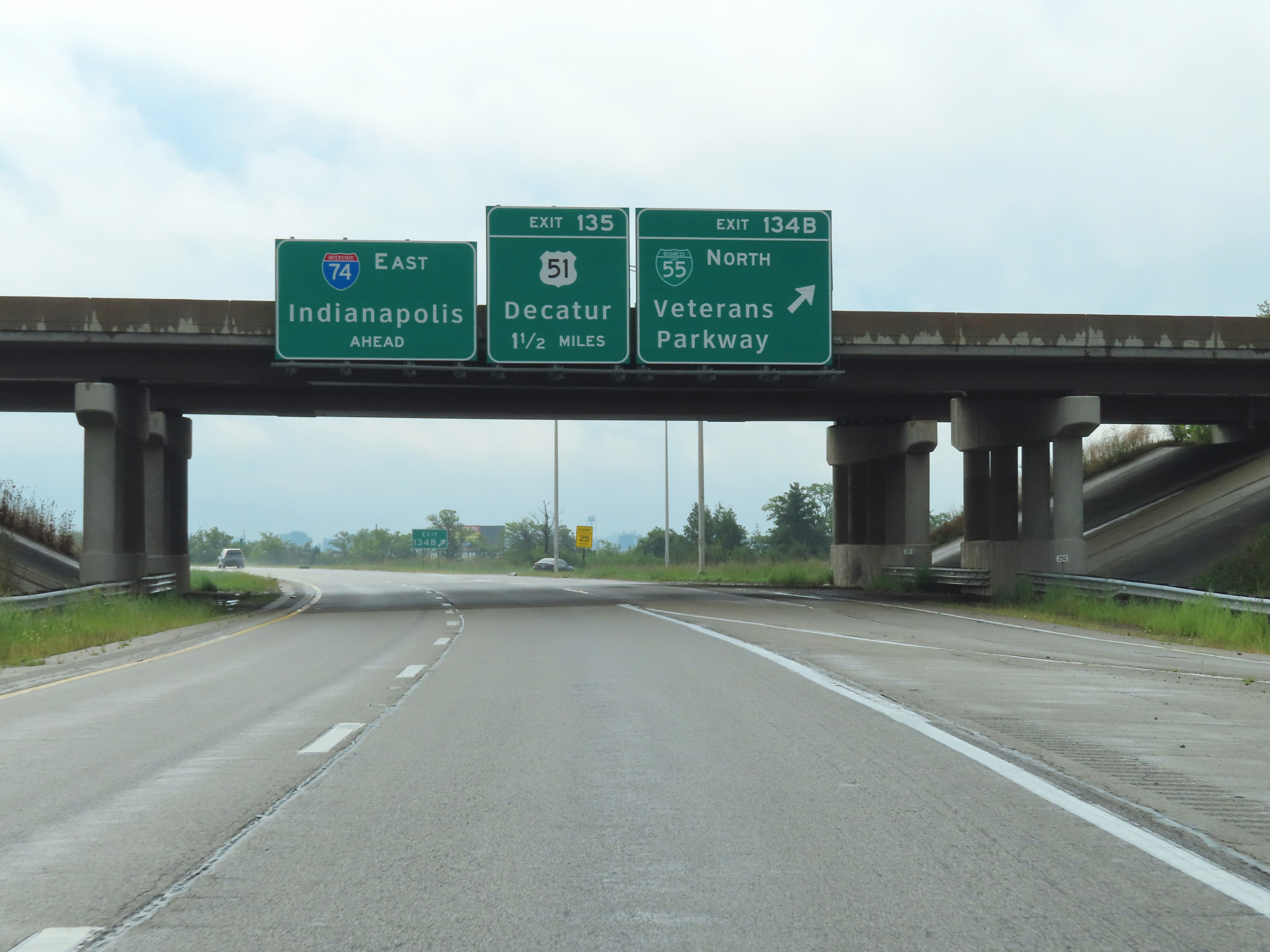 This sign at mile marker 13.2 shows that Interstate 74 East thru traffic will need to take the next ramp on the right, just ahead. (Photo taken 8/19/22). |